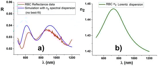 A reflectance curve, visible on the left (a), has been selected at the center of the RBC (red curve), marked in Figure 4. Solving procedures applied to the reflectance minima produce for n2 the values of 1.41, 1.45, and 1.43, respectively, with an averaged value of 1.43, while the evaluated thickness d2 is 750 nm ± 100 nm, both consistent with literature values. The overall shape is compatible with continuous n2 dispersion, represented by a Lorentzian shaped curve centered at 730 nm and with a width of 400 nm, visible on the right (b). No numerical best fit is used, but only a few values are chosen after some attempts. The normalizing ratio produce marked noise in the region around 1 µm (CCD section). The second detector data are not shown because simulation is unreliable in that region, due to accumulation of errors for the procedure of merging the two detector spectral regions.