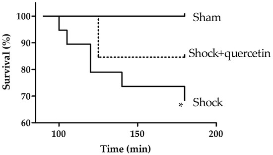 Kaplan–Meier survival analysis during the reperfusion period. Anaesthetized animals were submitted to shock and at time 90 they were reperfused with blood plus lactate Ringer and with vehicle or quercetin, and followed for an additional period of 90 min. * p < 0.05 vs. sham (log-rank test).