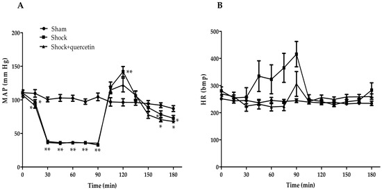Changes in (A) mean arterial blood pressure and (B) heart rate in the three experimental groups. Rats were subjected to laparotomy followed by controlled hypotension (shock phase) and then by resuscitation with lactate Ringer solution, shed blood and the quercetin or vehicle. Data are shown as the mean ± S.E.M. * p < 0.05 and ** p < 0.01 vs. sham group during reperfusion (Dunnett’s test).