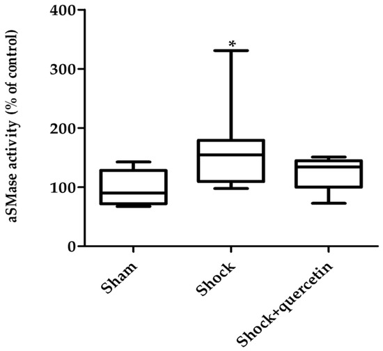 aSMase activity. Measurements were made in lung homogenate for a total time of 30 min expressed as nmol/min/mL. * p < 0.05 vs. sham group. Box-and-whisker plot showing medians with interquartile range and minimum and maximum values.