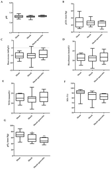 Arterial blood gases. (A) Values of pH; (B) carbon dioxide partial pressure (pCO2); (C) excess base; (D) bicarbonate (HCO3−); (E) total carbon dioxide concentration (TCO2); (F) arterial oxygen saturation (SO2) and (G) arterial oxygen partial pressure (pO2) in the sham, shock and shock + quercetin at 180 min (at the end of reperfusion). Box-and-whisker plot showing medians with interquartile range and minimum and maximum values. * p < 0.05 and ** p < 0.01 vs. sham group.