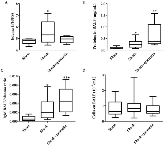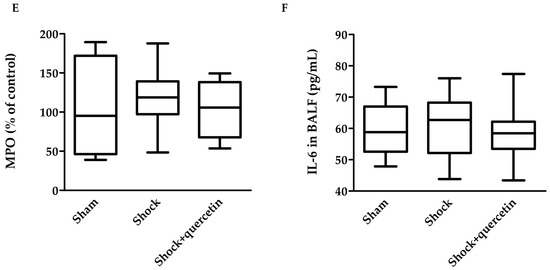 Figure 5A shows that animals submitted to shock plus reperfusion develop pulmonary edema, as indicated by an increase in the wet to dry lung weight ratio. Quercetin inhibited the development of edema. Proteins in bronchoalveolar lavage fluid (BALF) and IgM, used as markers of pulmonary vascular permeability, increased in the shock compared to the sham group (Figure 5B,C). Paradoxically, quercetin increased the proteins levels and IgM concentration in BALF. Cell counting in BALF and the myeloperoxidase activity in lung homogenates were not significant among groups (Figure 5D,E). IL-6 concentration in BALF (Figure 5F) or in plasma (not shown) was similar between sham and shock groups.