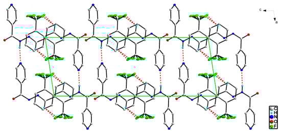 The crystal packing of ligand L2, viewed along the b axis. Red dashed lines indicate hydrogen interaction.