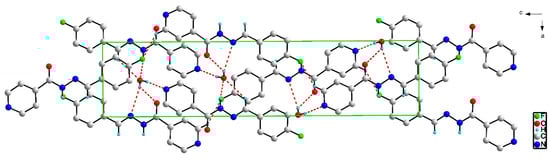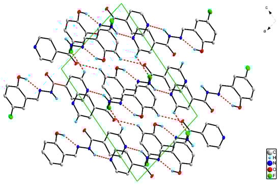 The molecule for all ligands comprises three chemical moieties: pyridine, benzene (substituted with –OH, –F and –CF3), and hydrazone. The ligand molecules are not planar, with the angles between the benzene and pyridine rings being 4.05° for L1, 51.62° for L2, 11.55° for L3, and 10.19° for L4. C–N and N–N bond distances (Table 1) are shorter than a typical C–N, N–N single bond 1.405(6) Å [30,31,32], indicating significant π delocalization along the NNC(O)C moiety. The shorter C–N and N–N bond distances (Table 1) were observed in other compounds; for C–N, the bond distance is in the range of 1.343(2) Å–1.362(6) Å, and for N–N, the bond distance is in the range of 1.359(5) Å–1.384(3) Å [33,34,35,36,37,38,39,40,41,42]. The N=C bond distances (Table 1), are typical for a double bond. For all ligands, the central torsion angles C1–N2–N3–C7 are listed in Table 1. The crystal structures of ligands L1–L4 are stabilized by a system of intermolecular and intramolecular (for L2 and L4) hydrogen interactions (Table 2, Figure 2, Figure 3, Figure 4 and Figure 5).
