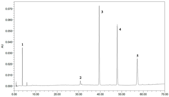 The first step in the quantitation of the five standards in R. rugosa (structures shown in Figure 1 and UPLC chromatographic peaks in Figure 2) is the full extraction from materials [,]. The preliminary tests made in this study indicated that the different extraction methods (ultrasonication, reflux, and Soxhlet) have a great influence on the content of the five standards. The contents of the five compounds are higher when subjected to the ultrasonic extraction standards method compared with those subjected to other methods. In order to optimize ultrasonic extraction conditions, different extraction solvents such as methanol, ethanol, and different combinations of water and ethanol were used with ethanol concentrations of 20%, 40%, 60%, 80%, and 95%, v/v. Extraction time was varied in each case: 30, 40, 50, or 60 min. By comparing the total weight of exact and areas of the characteristic peaks in each chromatogram of different factors, the optimal condition for extraction was selected as below for each sample: 5.0 g of dry powder was extracted with 100 mL of 60% (v/v) aqueous ethanol in an ultrasonic bath for 60 min.