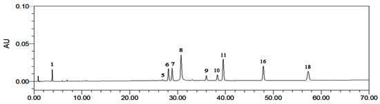 To standardize the fingerprint, 10 samples were analyzed. Software called Similarity Evaluation System for Chromatographic Fingerprint of Traditional Chinese Medicine (Version 2004A) [] (Figure 3) was used to evaluate chromatograms. These samples had similar UPLC profiles. Peaks that existed in all 10 samples with relatively high intensity and good resolutions were assigned as “characteristic common peaks” for identification of the plant. There were 23 characteristic peaks (from Peaks 1 to 23) found in the chromatogram, which covered more than 65% of the total area. Ten components were identified by comparing their retention time and UV spectrum with those of standard compounds: Peak 1: GA; Peak 5: 2-phenylethyl-O-β-d-glucopyranoside; Peak 6: quercetin-3-O-(2′′-O-β-d-glucopyranosyl)-β-d-glucopyranoside); Peak 7: juglanin (28.9 min); Peak 8: EC (30.7 min); Peak 9: avicularin (36.0 min); Peak 10: quercetin (38.3 min); Peak 11: kaempferol-3-O-sophoroside (38.9 min); Peak 16: hyperoside (48.9 min); Peak 18: astragalin (57.3 min) (Figure 4). The other 13 common fingerprint peaks were unknown. To calculate the RRT and RPA of each characteristic peak, a reference peak should be chosen. Ellagic acid (Peak 8) had a considerably high content of more than 0.46% of the total area, and it also had moderate retention time, a stable peak area, and a good shape in the R. rugosa chromatograms. Therefore, it was chosen as the reference peak. Then, the retention time and peak area of the 23 common peaks were measured; RRT and RPA of all characteristic common peaks with respect to this reference peak were calculated (Table 3).