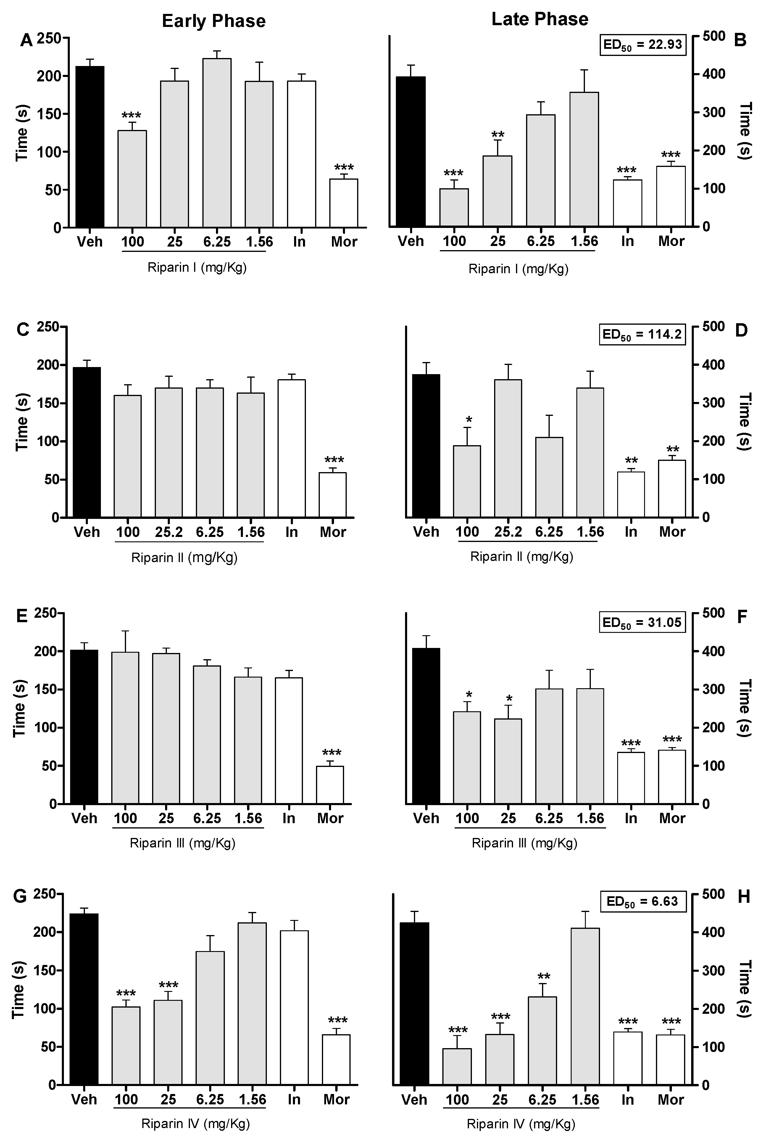 Figure 2. Antinociceptive effects of riparins I, II, III and IV on formalin test. Panels (A,C,E,G) represent the effects of riparins I–IV, respectively, on the early phase of formalin-induced nociception in mice. Panels (B,D,F,H) represent the effects of riparins on the late phase of formalin test. ED50 values for riparins were calculated using the percent of nociception reversion at late phase of the formalin test. For the dose-response analysis, the effects of increasing doses of riparins (1.56 to 100 mg/kg) were tested. Mice were treated with riparins I–IV or vehicle (Veh; Tween 80 5%; control group) by intraperitoneal route 40 min before formalin (injected at time zero). Indomethacin (In; 5 mg/kg) and morphine (Mor; 5 mg/kg) were used as reference drugs. All data are reported as means ± SEM; n = 6 mice per group. * Significantly different from control group (p < 0.05); ** Significantly different from control group (p < 0.01); *** significantly different from control group (p < 0.001) as determined by ANOVA followed by Tukey’s test.