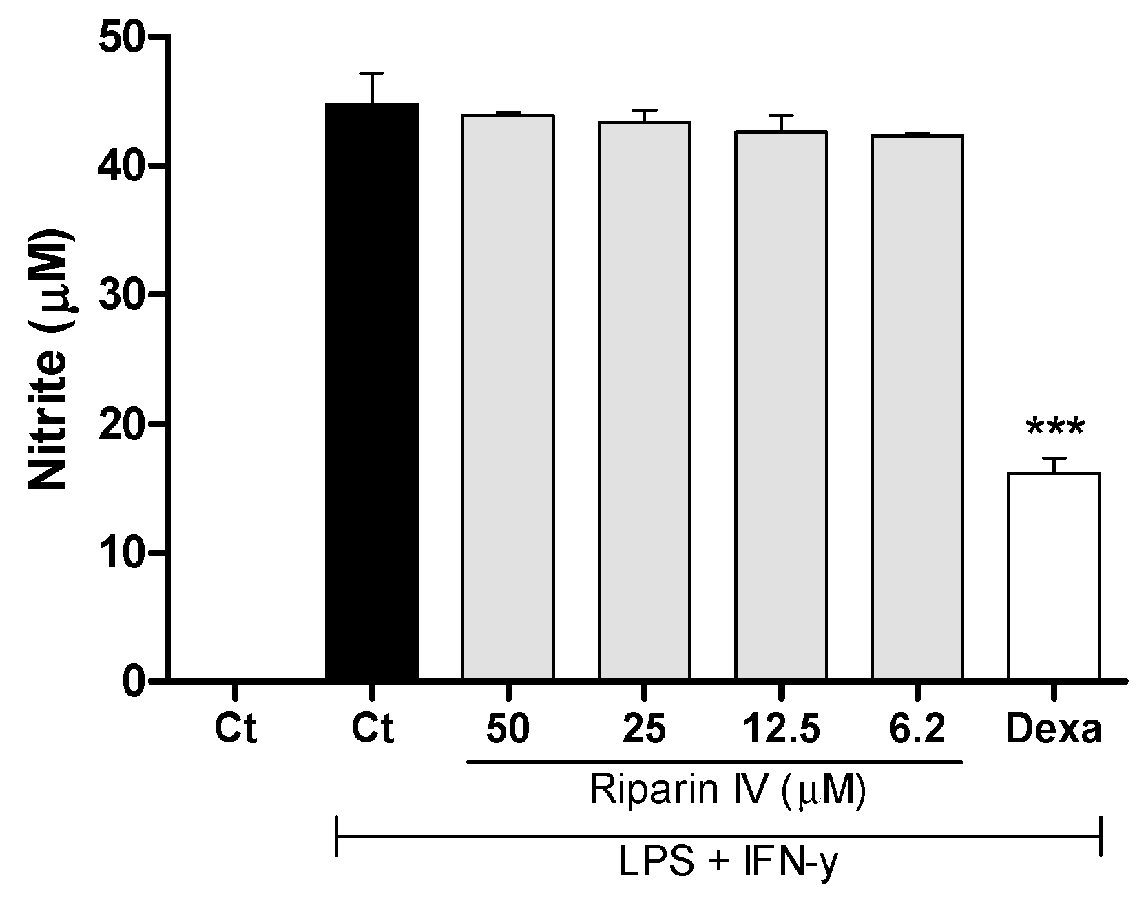 Figure 6. Effect of riparin IV on nitric oxide production in J774 macrophages. Concentrations of nitrite were determined in J774 macrophages treated with vehicle (Tween 80 5%, Ct, control group), riparin IV (6.2–50 μM) or dexamethasone (Dexa; 40 µM) in the presence of LPS (500 ng/mL) + IFN-γ (5 ng/mL). Cell-free supernatants were collected for nitrite quantification by the Griess method. Values represent the means ± SEM of three determinations obtained in one of three experiments performed. *** Significantly different from the vehicle treated cultures (p < 0.001). ANOVA followed by Tukey´s multiple comparison test.