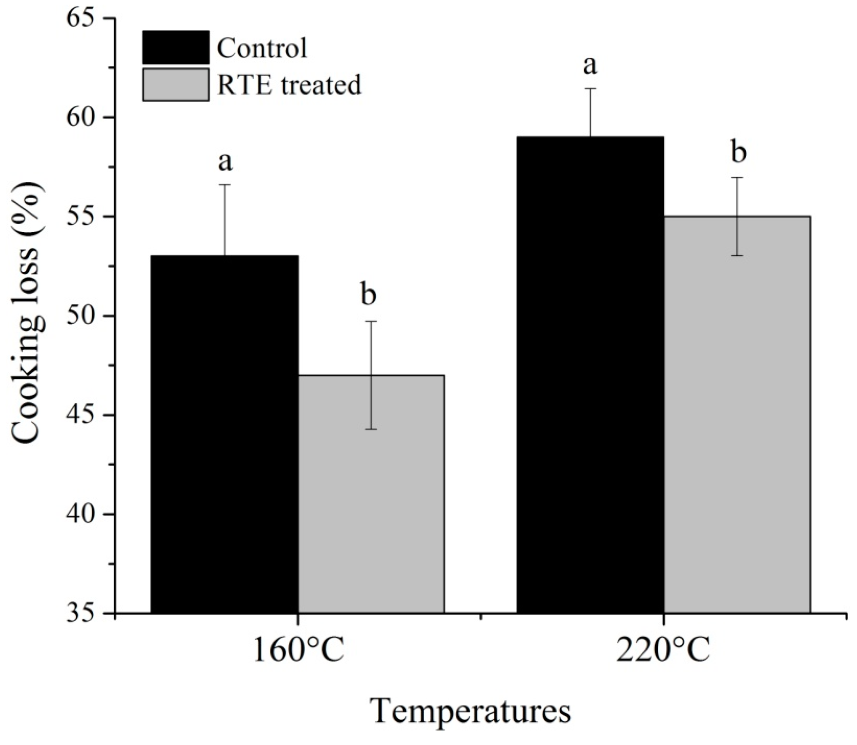 Effects of the Rosa rugosa tea extract (RTE) on the cooking loss; means ± SD of triplicate analyses; means bearing different letters (a, b) between control and RTE treated groups of single temperature indicate significant difference (p < 0.05).