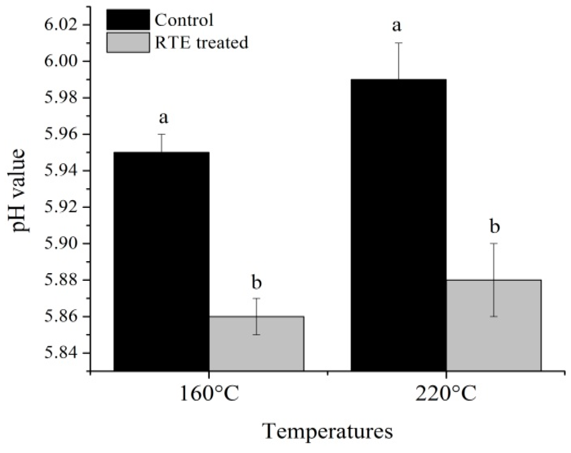 Effects of the Rosa rugosa tea extract (RTE) on the pH value; means ± SD of triplicate analyses; means bearing different letters (a, b) between control and RTE treated groups of single temperature indicate significant difference (p < 0.05).