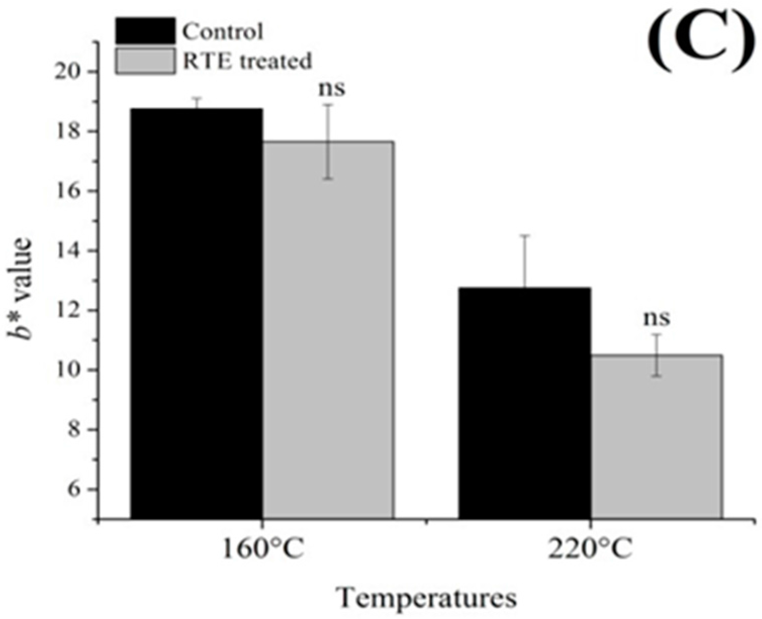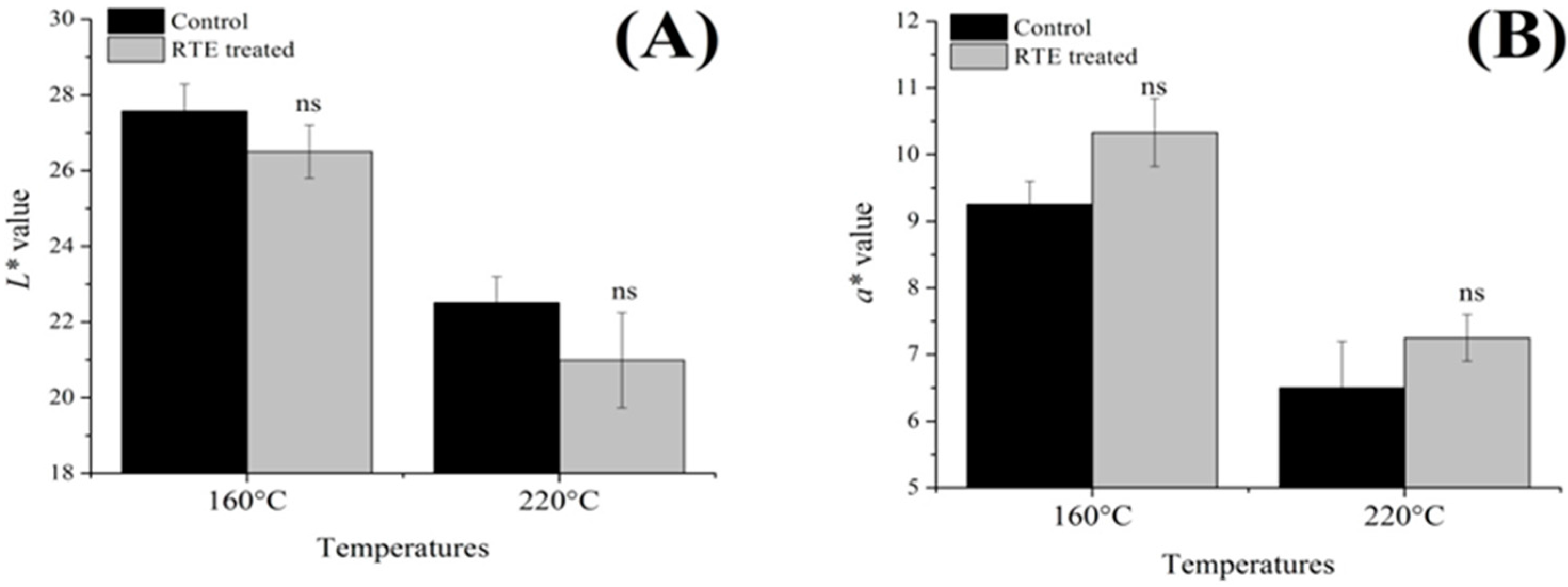 Effects of the Rosa rugosa tea extract (RTE) on the color value; (A–C) for L*, a*, and b*, respectively; means ± SD of triplicate analyses; ns = not significant (p > 0.05).