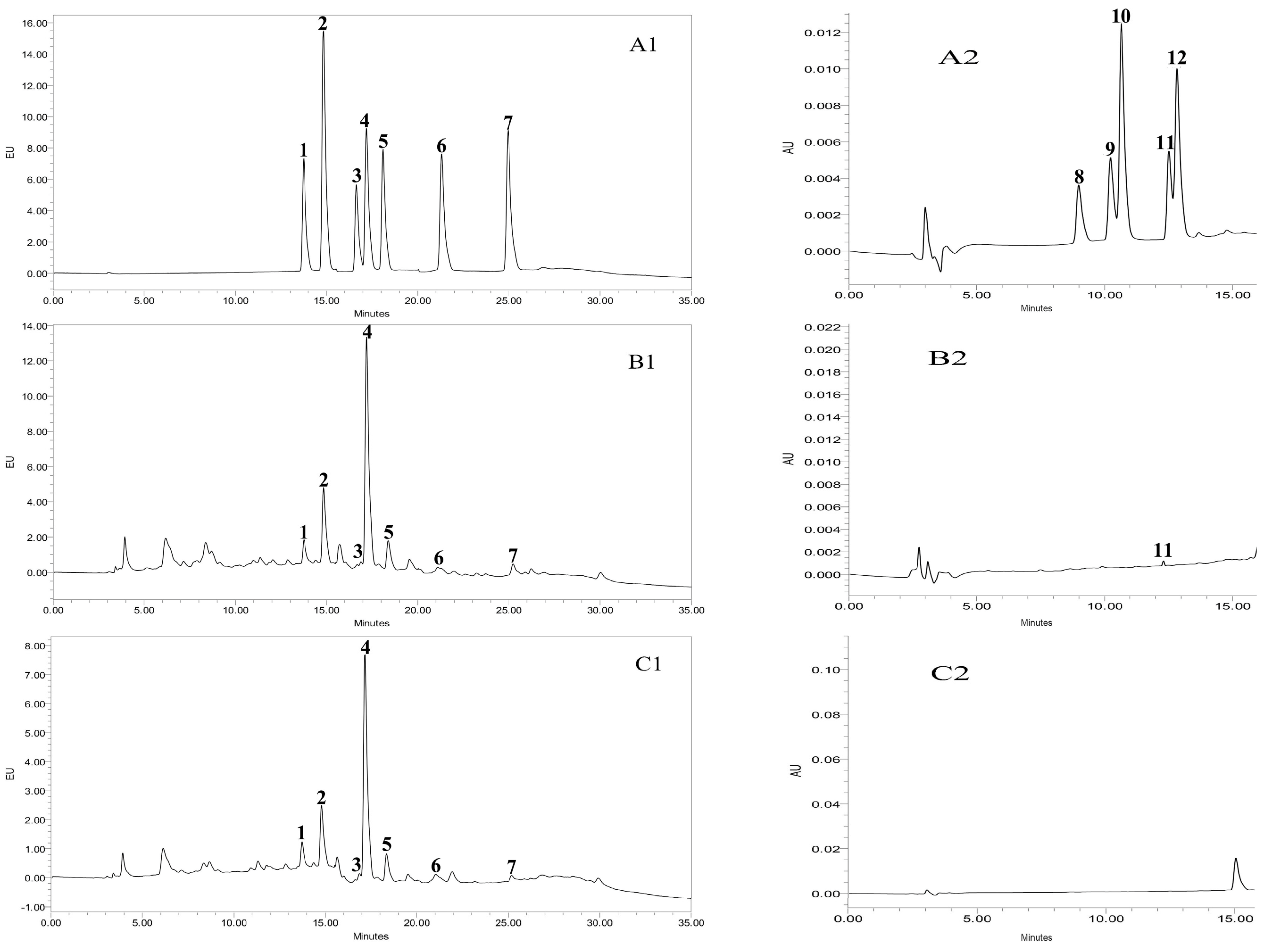 HPLC chromatograms of the HCA standard mix (A1) for Non-IQ-type HCAs (10 ng/mL) by fluorescence detection and (A2) for IQ-type HCAs (100 ng/mL) by UV detection; (B1,B2), HCAs in fried beef patties without the Rosa rugosa tea extract (control) at 220 °C detected by fluorescence and UV detection, respectively; (C1,C2), HCAs in fried patties with the Rosa rugosa tea extract at 220 °C detected by fluorescence and UV detection, respectively. Peaks: 1. Norharman, 2. Harman, 3. Trp-P-2, 4. PhIP, 5. Trp-P-1, 6. AαC, 7. MeAαC, 8. IQ, 9. MeIQ, 10. MeIQx, 11. 7,8-DiMeIQx, 12. 4,8-DiMeIQx.