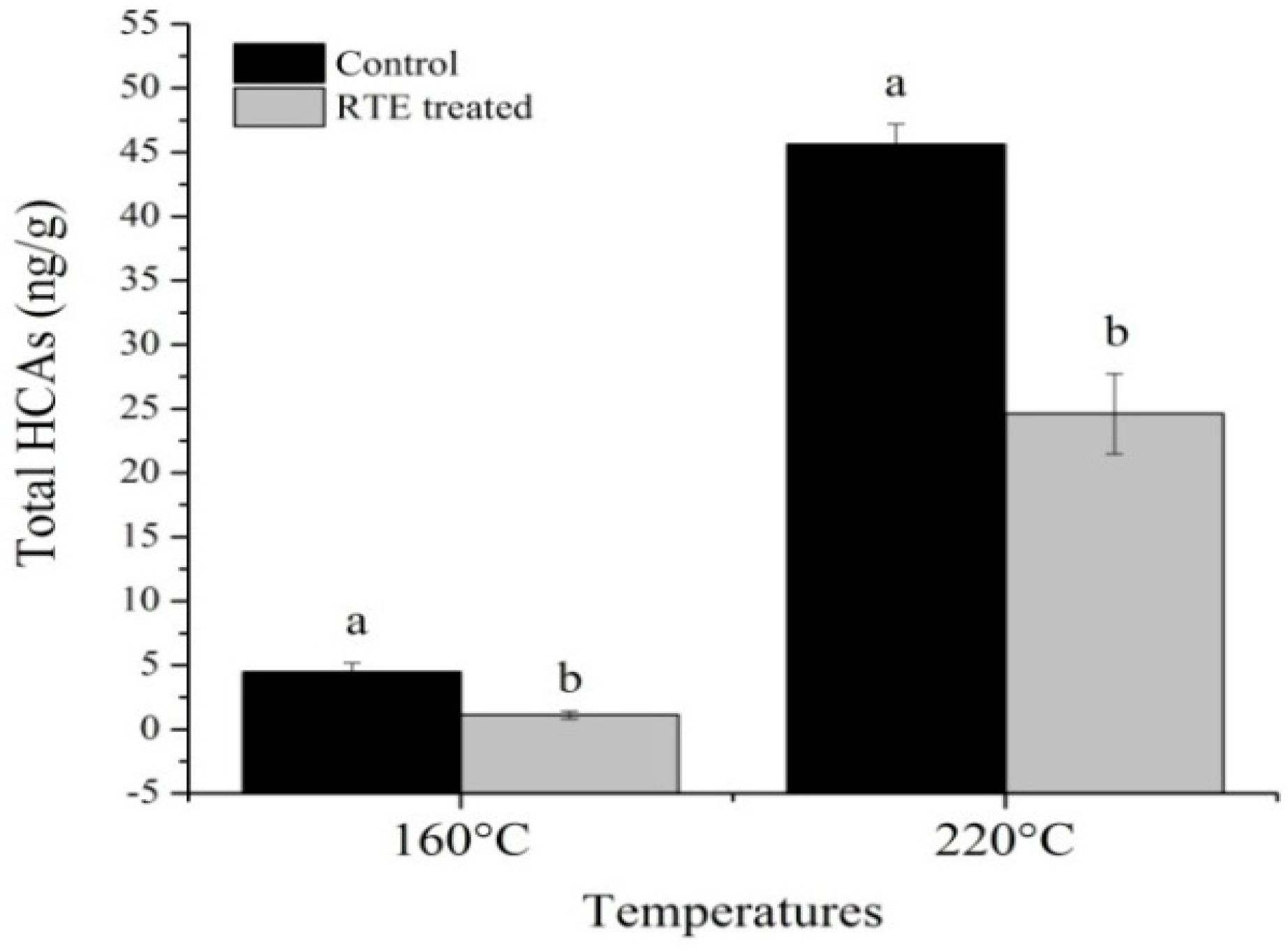 Effects of the Rosa rugosa tea extract (RTE) on the total HCAs; means ± SD of triplicate analyses; means bearing different letters (a, b) between control and RTE treated groups of single temperature indicate significant difference (p < 0.05).