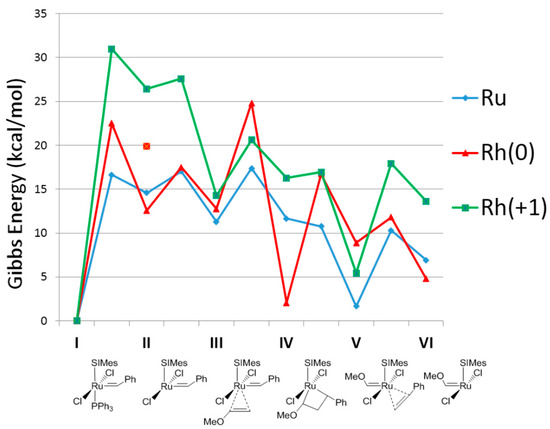 Figure 1 includes the free energy surface for Rh(SIMes)Cl2(=CHPh)PPh3 (both neutral and +1 charged) catalyzed metathesis with vinyl ethers, specifically the energy profile for the first turnover of this reaction. Although the latter substrate is known to lead to catalytically inactive Fischer-type carbenes after a single turnover it provides a straightforward reaction with which to study the initiation kinetics, either experimentally [61,62] or theoretically [54]. However, although the kind of olefin may not affect the first turnover, it might affect the propagation steps [42,43,54]. In Figure 1 the energy values are compared to the corresponding Ru(SIMes)Cl2(=CHPh)PPh3 analogue. Focusing on the first turnover, using the neutral [Rh(SIMes)Cl2(=CHPh)PPh3] as a catalyst, Figure 1 gives the result that the simplest dissociative pathway starts with the initial loss of PPh3 ligand in precatalyst I, forming the catalytically active 14e species II, which is placed 12.6 kcal/mol above I, requiring the overcoming of a barrier of 22.5 kcal/mol. Bearing a low barrier of 4.9 kcal/mol, the relative low stability of species II assists the next olefin coordination to the metal center to give the intermediate III, which is practically isoenergetic with respect to the 14e species II. However, the concerted initiation step that links I directly to III here turns out to be favored, defining an energy barrier 2.6 kcal/mol lower than the upper barrier of the dissociative mechanism that corresponds to the transition state I-II.