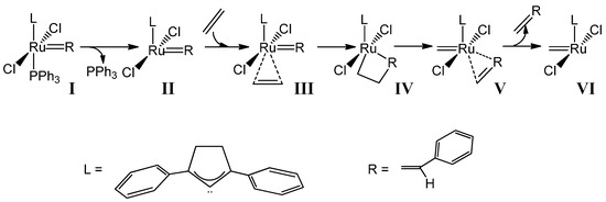 During the last three decades, thousands of papers have presented and described the olefin metathesis catalysis, by experimental synthesis and characterization [1], as well as in the validation of computational protocols [2,3,4,5,6,7,8,9]. However, neither a general catalyst for any metathesis reaction [10,11,12] nor perfect rules are available to predict the behavior of a given catalyst has been achieved [13,14], bearing the efforts in characterizing the decomposition reactions [15]. However, olefin metathesis has successfully achieved the goal of organic synthesis that consists of reactions that drive to the formation of carbon-carbon bonds [16,17,18], and provides a route to unsaturated molecules. Basically, the area of ruthenium-catalyzed [19,20] olefin metathesis reactions centers the last industrial applications during the last decade [21], inspired by the previous discovery first by Grubbs et al. of well-defined Ru-based catalysts, such as (PCy3)2Cl2Ru=CHPh [22], together with the substitution of one phosphine group by a N-heterocyclic carbene, NHC [23,24], increasing strongly the activity [25,26]. Once a better understanding of the performance of such catalysts was achieved, a rational design of new more active catalysts was envisaged [27,28] Despite experimental [29,30,31] and theoretical [32,33] insights during the last two decades, demonstrating the mechanism bears a metallacycle as suggested by Chauvin [34], still there are chances to improve the catalysis in olefin metathesis [35,36], mainly due to the undesired parallel reactions [37,38,39], or low capability to deal with water or alcohols as solvents [40,41].