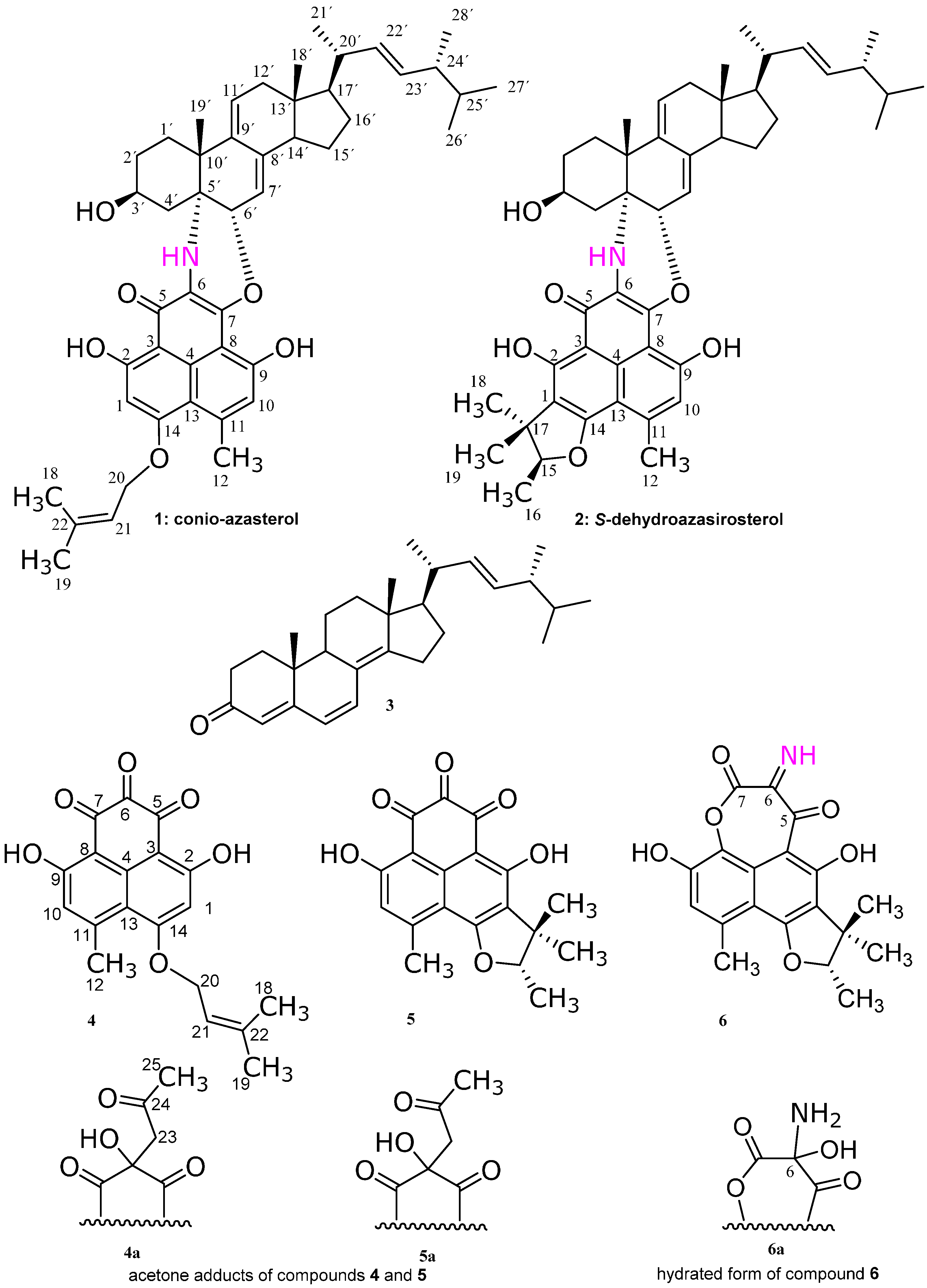 Subfraction 11 of the ethyl acetate extract of the mycelium of C. cereale was subjected to RP-HPLC separation to give the yellowish brown compounds 1 and 2. At first glance, from their 1H- and 13C-NMR spectra, they were suspected to be a mixture of a sterol and a phenalenone like compounds, though the HPLC chromatogram showed only one peak for each compound. Further elucidation of the mass gave a signal at 733 Da correspondent to a molecular formula C47H59NO6, suggesting that compounds 1 and 2 are adducts of a sterol and phenalenone derivatives. Further investigation of the 1D and 2D NMR spectra confirmed the adduct formation as follows.