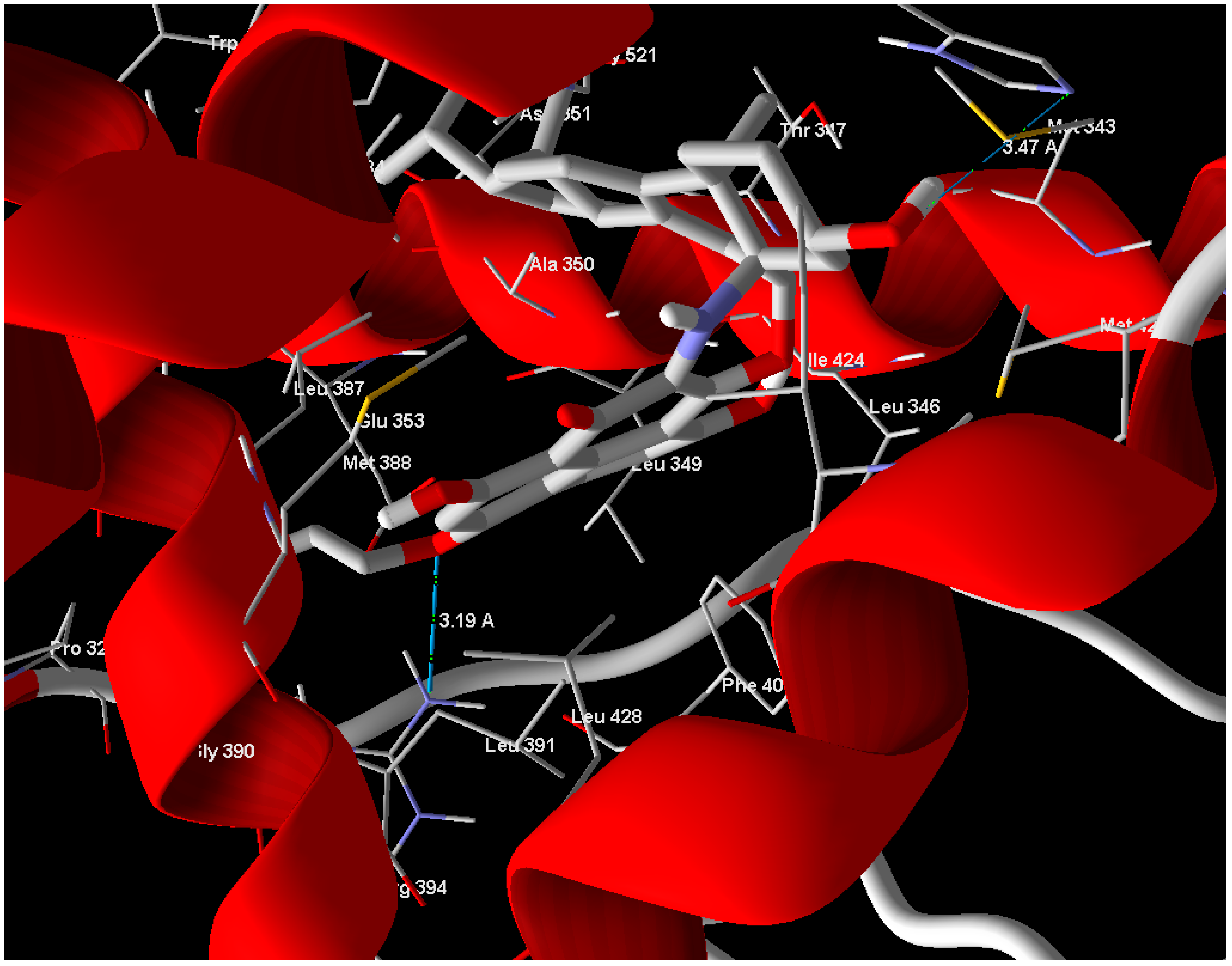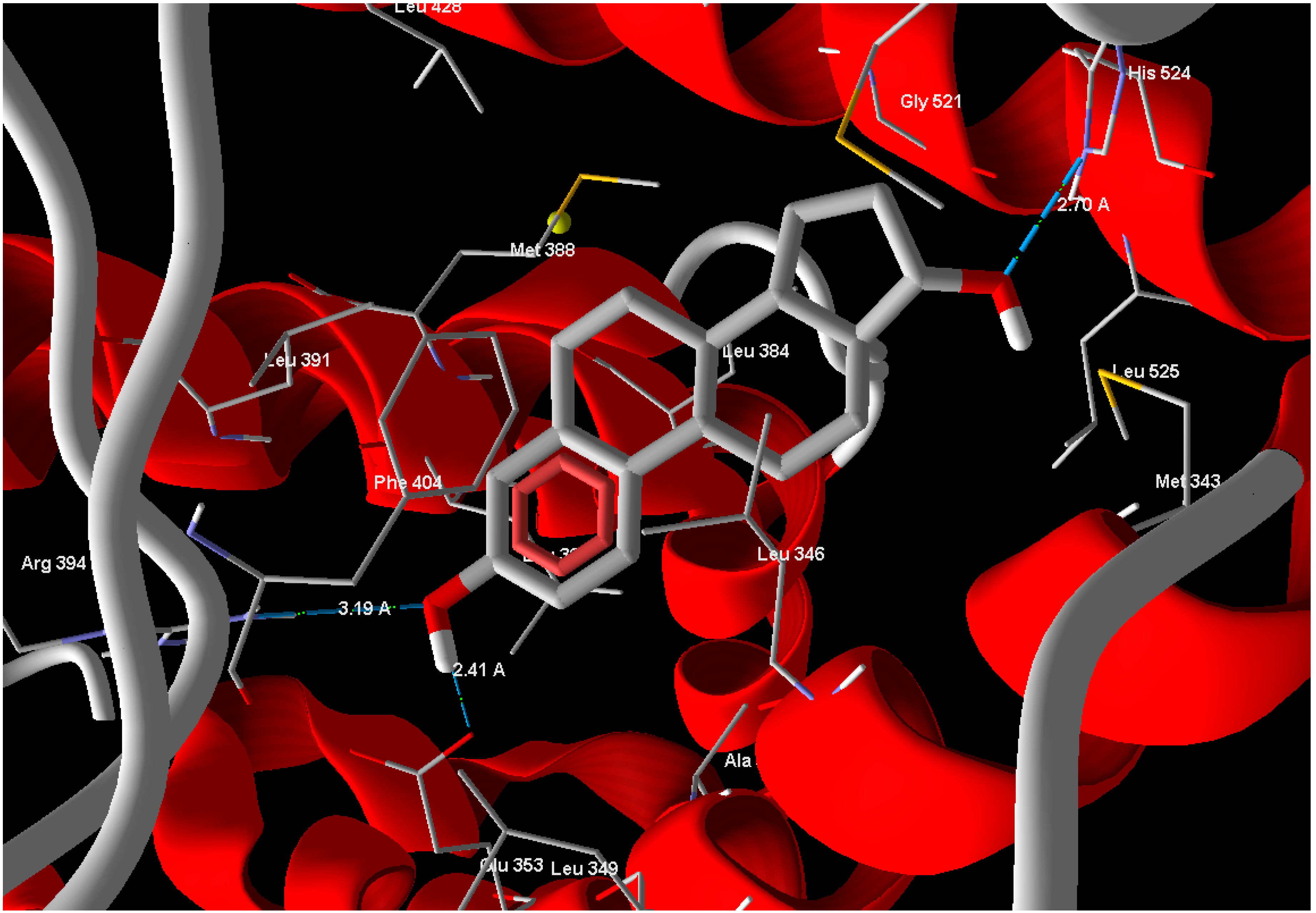 Arg 394 and His 524 with bond lengths 3.19 Å and 3.47 Å, respectively, in addition to hydrophobic interaction with Phe 404 and Trp 383 (