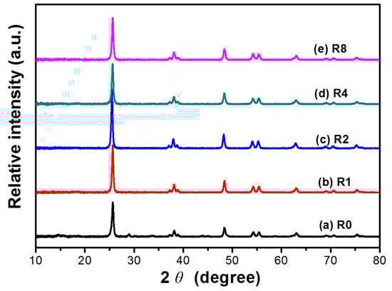XRD patterns of TiO2 nanorods prepared in the presence of different R (weight ratio of thiourea to TiO2).