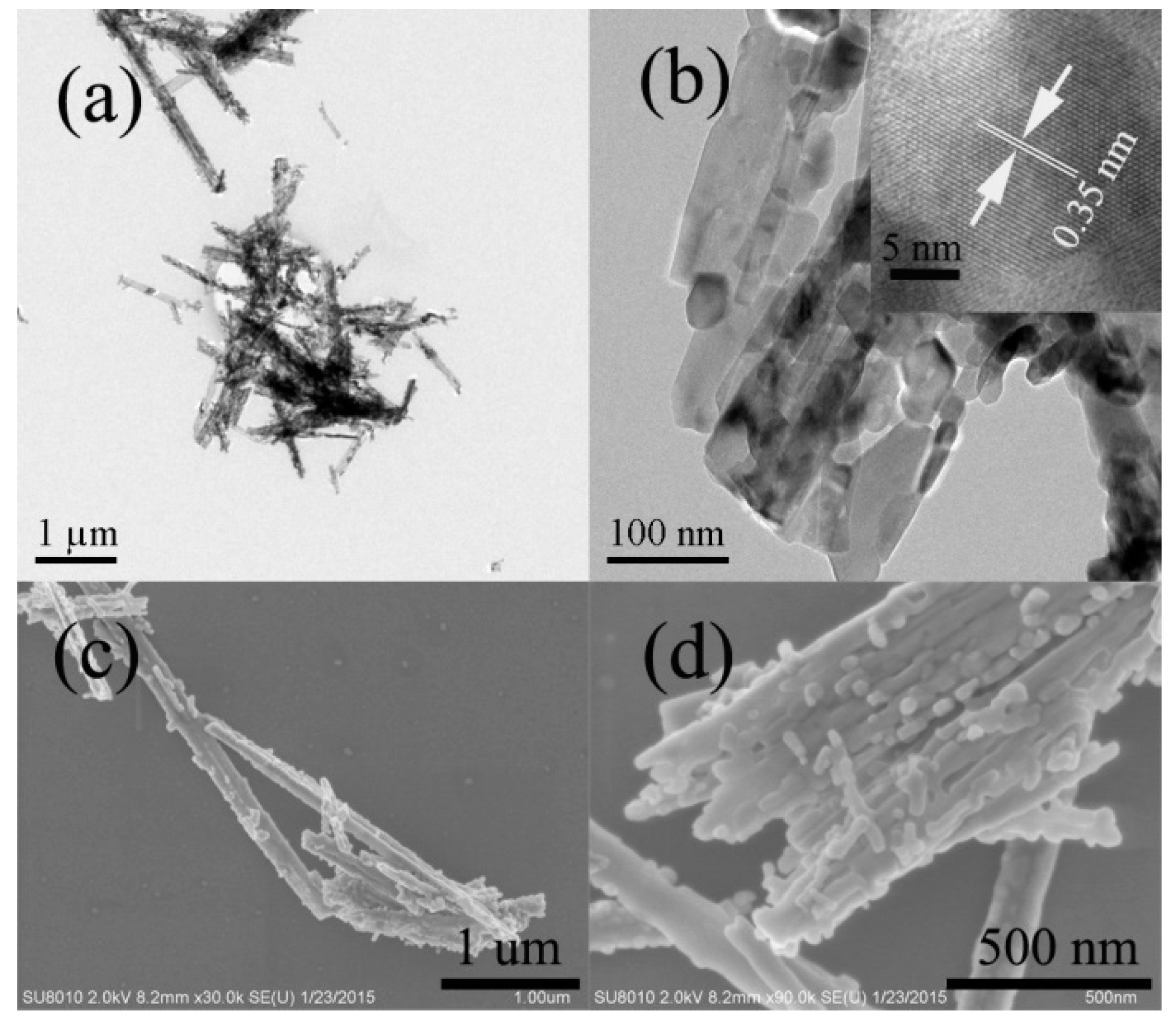 - Li, J.M.; Xu, D.S. Tetragonal faceted-nanorods of anatase TiO2 single crystals with a large percentage of active {100} facets. Chem. Commun. 2010, 46, 2301–2303. [Google Scholar]