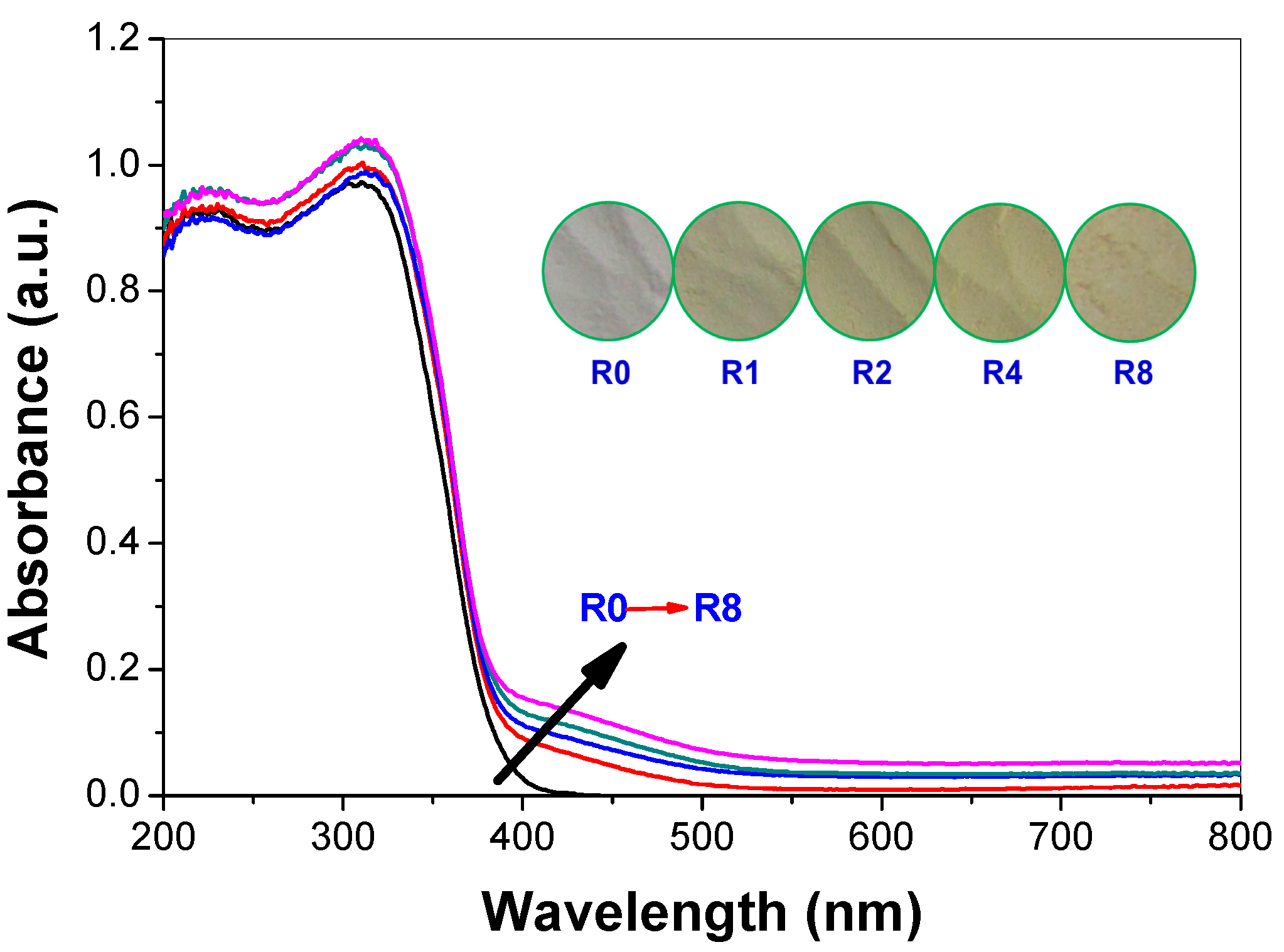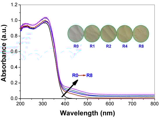 Usually, doping obviously influences light absorption characteristics of TiO2 [29]. Therefore, the optical property of the pristine and thiourea-modified TiO2 nanorods were measured by UV-vis diffuse reflectance spectra. As displayed in Figure 4, all of these samples display the typical absorption with an intense transition in the UV region of the spectra, which is assigned to the intrinsic band gap absorption of TiO2 due to the electron transitions from the valence band to conduction band (O2p → Ti3d) [30]. The pure TiO2 (R0) shows no absorption above its fundamental absorption edge (around 400 nm). In contrast, the absorption spectra of the thiourea-modified TiO2 samples show enhanced absorption in the visible region. The inset in Figure 4 shows the corresponding photos of pristine and thiourea-modified TiO2 samples. It can be seen that the color of TiO2 sample becomes deeper with an increase in R value, which is consistent with the diffused reflectance spectroscopy. Undoubtedly, these results reveal that the nonmetal elements are indeed incorporated into the lattice of TiO2, forming two phase structures (pristine and doped anatase TiO2 nanorods). Judging from the orange color of the samples (inset of Figure 4), a black graphitic carbon shell on the surface of TiO2 nanorods is unlikely to be formed, which is consistent with the high-resolution TEM characterization result (inset of Figure 3b).