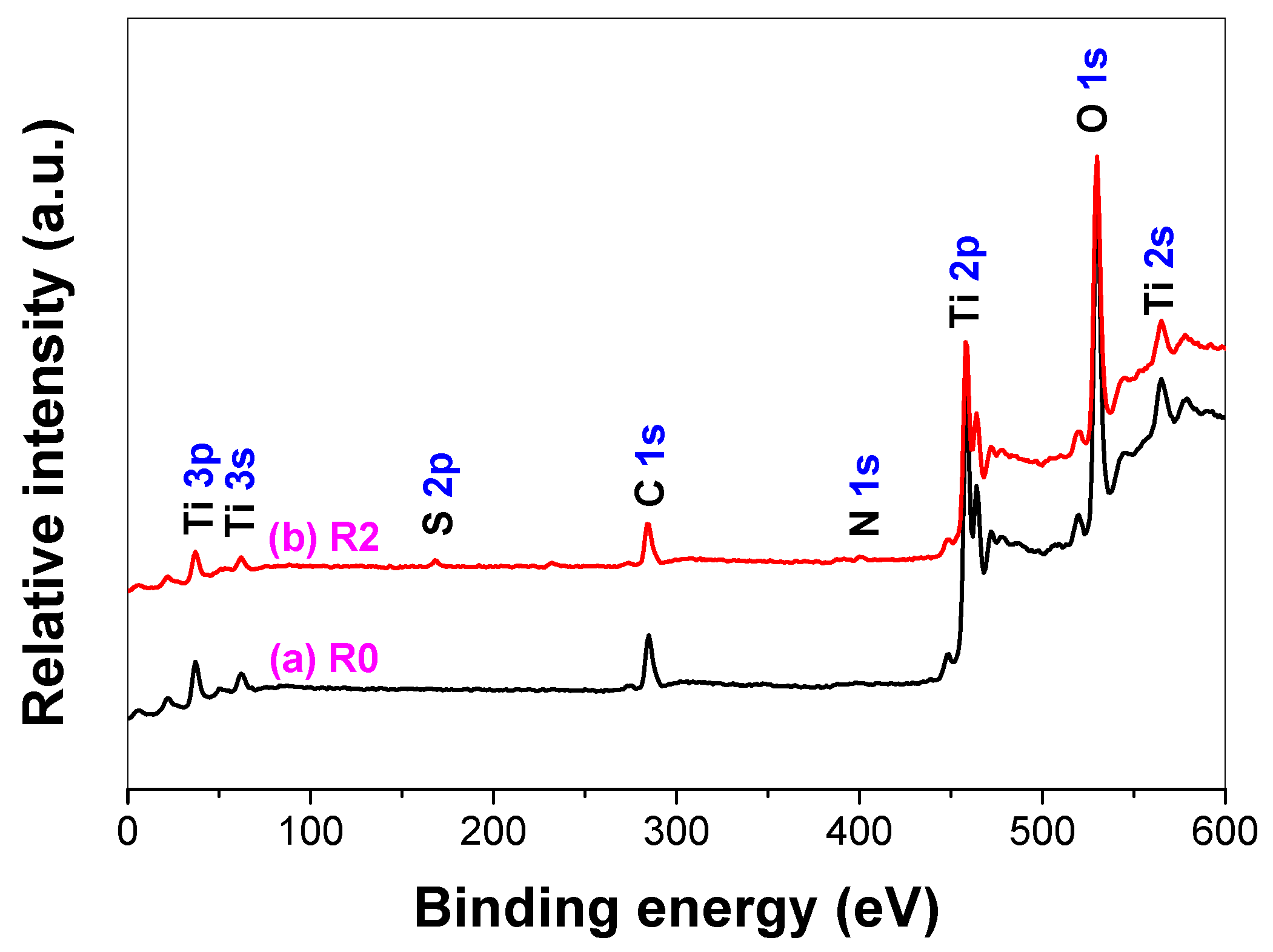 Figure 5 compares the XPS survey spectra of pristine (R0) and thiourea-modified TiO2 nanorods (R2). As demonstrated by XPS, both samples contain Ti, O and C elements. However, small amounts of N and S elements were also detected for thiourea-modified TiO2 nanorods.