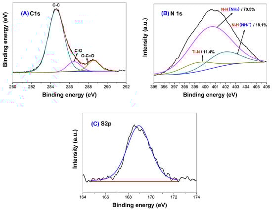 High-resolution XPS spectra of the C 1s (A); N 1s (B) and S 2p (C) regions of R2 sample.