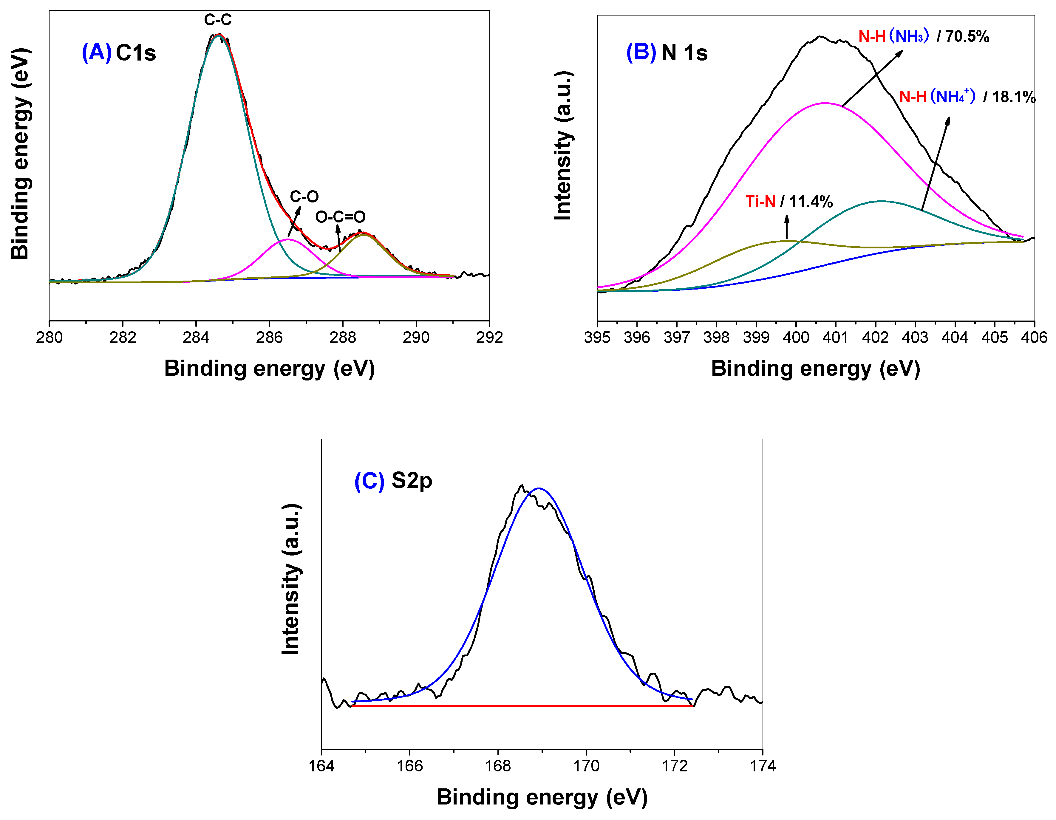 Figure 6 shows the high-resolution XPS spectra of C 1s, N 1s and S 2p regions for thiourea-modified TiO2 nanorods, respectively. From Figure 6A, it can be seen that the spectrum of C 1s can be deconvoluted into three peaks, one strong peak and two week peaks at binding energies of 284.6, 286.6 and 288.6 eV, implying three different chemical environments of carbon in the R2 sample. The peak around 284.6 eV is usually assigned to carbon adsorbed on the surface of the photocatalyst as a contaminant, namely C-C bonds, which cannot be eliminated. The peak at 286.6 eV can be ascribed to the existence of C-O bonds, as carbonate species. The peak observed at binding energy of 288.6 eV is attributed to O-C=O bonds [11]. No peak was observed at a binding energy of about 282 eV, corresponding to the incorporation of C atoms in form of Ti-C bond, reflecting that C element was not doped into the lattice of TiO2 nanorods [30]. The pertaining peaks in the XPS spectrum may be due to the presence of adventitious carbon species.