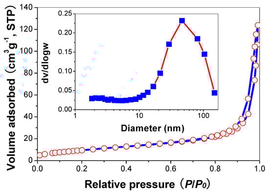 Figure 7 shows the nitrogen sorption isotherms and the corresponding pore size distribution curves of R2 sample. It can be seen that the isotherm is of types IV (BDDT classification) [35]. At high relative pressure range from 0.8 to 1.0, the isotherm exhibits a hysteresis loop of type H2 associated with the ink bottle pores, indicating that the powders contain mesopores (2–50 nm). The corresponding pore size distribution curve of R2 exhibits a wide pore size distribution with the average pore diameters about 12.7 nm.