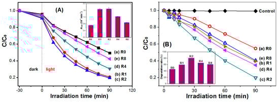 Photocatalytic degradation profiles of X3B (A) and RhB (B) under visible-light irradiation in the presence of different TiO2 nanorods photocatalyst (inset: comparison of the corresponding photocatalytic activity).