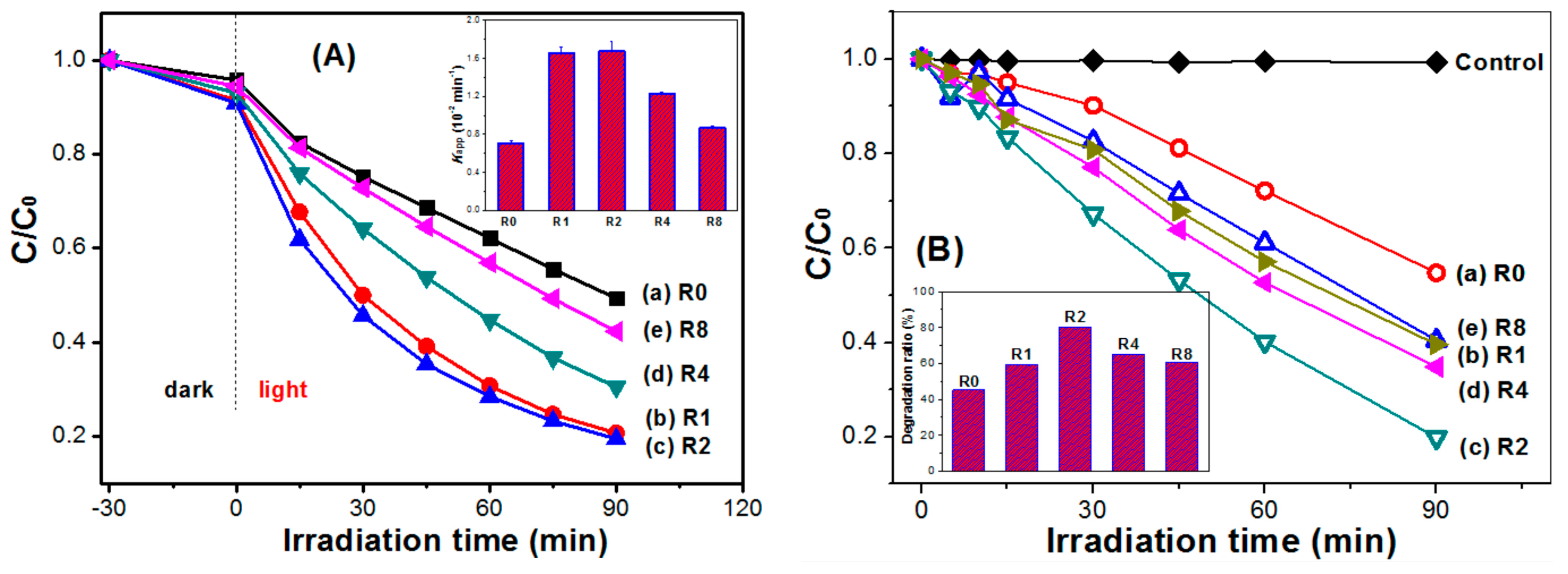 To study the effect of thiourea modification on the photocatalytic activity of TiO2 nanorods, both degradation of X3B (Figure 8A) and RhB (Figure 8B) dye under visible irradiation (Figure 8) and formation of •OH radicals in solution (Figure 9) under UV irradiation were performed. From Figure 8A, it can be seen that pristine R0 shows the smallest adsorption to X3B (only 4.12%), while R2 sample shows the highest adsorption (9.13%). It has been well documented that preliminary adsorption of substrate on the catalyst surface is a prerequisite for highly efficient oxidation [36]. The stronger adsorptive ability of R2 should facilitate the enhancement of its photocatalytic activity. Inset of Figure 8 compares the degradation rate constant of X3B in different photocatalysts. It can be clearly seen that R2 sample shows the highest photocatalytic activity (0.017 min−1), which is two times higher than pristine TiO2 nanorods (0.0071 min−1 for R0). This is consistent with their adsorption capabilities. Similar results were also obtained in photocatalytic degradation of RhB dye. The R2 sample shows the highest degradation ratio of RhB (80.13%), which is almost two times higher than the R0 sample (only 47.27%).