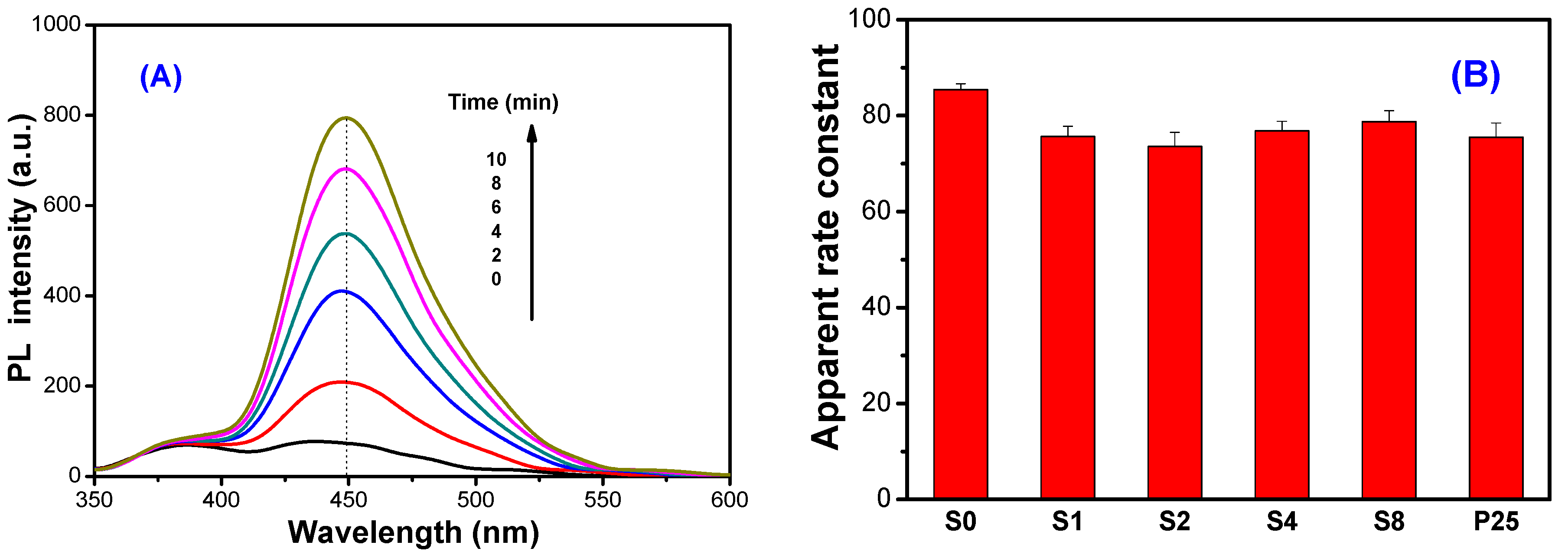 PL spectral changes (A) observed during irradiation of the R2 sample in 5.0 × 10−3 mol·L−1 solution of coumarin (excitation at 332 nm) under UV irradiation, and the comparison of formation rate constant of hydroxyl radicals in the different photocatalyst (B).