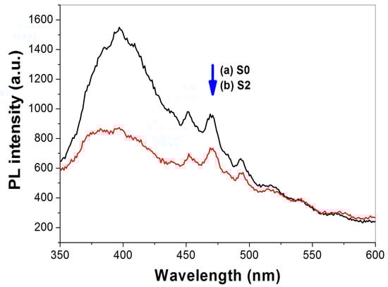 Photoluminescence (PL) analysis is commonly used to analyze the recombination rate of photo-generated electron-hole of semiconductor [41]. Herein, we conduct PL measurement for the pristine (R0) and thiourea-modified TiO2 sample (R2), respectively. It can be seen that the emission spectra shapes of R0 and R2 are similar (Figure 10). The strong peak at about 397 nm is attributed to the emission of band gap transition [30]. When compared with pure TiO2 nanorods (R0), the intensity of PL signal for R2 is much lower. This is due to the reduction of the radiative recombination process, that is, the lower the recombination, the weaker the PL signals are. Consequently, it is understandable that thiourea-modified TiO2 nanorods show superior photocatalytic activity to that of pristine TiO2 nanorods (R0).