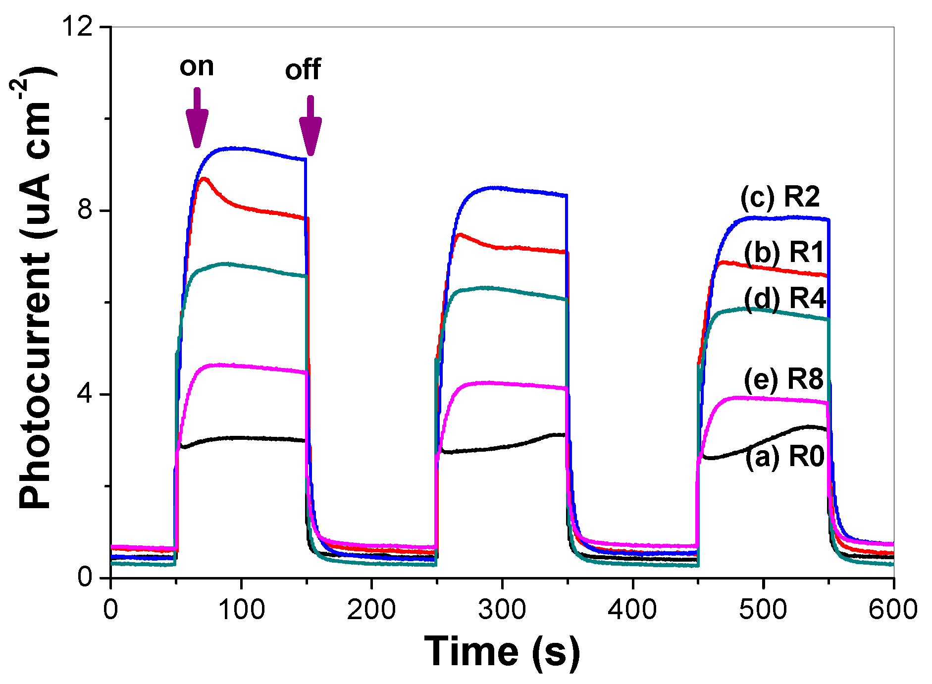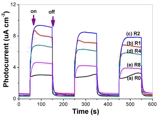 The value of photocurrent can indirectly reflect the semiconductor’s ability to generate and transferr photo-generated charge carriers under irradiation [30]. The photocurrent responses of pure and thiourea-modified TiO2 nanorods were tested in several on-off cycles (Figure 11). A prompt generation of photocurrents are observed and with good reproducibility when the ITO/TiO2 electrodes are illuminated. While the lamp is off, the value of photocurrent for all the ITO/TiO2 samples are instantaneously close to zero. It can be clearly seen that the photocurrent value increases first and then decreases with increase in the R value, and R2 sample shows the highest photocurrent value, which is consistent with the photocatalytic activity of the samples (Figure 8). The photocatalytic activity of TiO2 is highly related to the number of the separated photo-generated charge carriers. Nonmetal doping, in particular nitrogen doping, can be incorporated as a substitutional or insterstitial state in the TiO2 lattice, which results in the visible-light activity [6]. From the photocurrent, it can be seen that high concentrated N-doping can cause the formation of photo-generated electron-hole recombination center, which is detrimental to the photocatalytic activity of TiO2 nanorods. Therefore, it is understandable that R2 shows superior photocatalytic activity, although R8 possesses the highest visible-light harvesting ability (Figure 4).