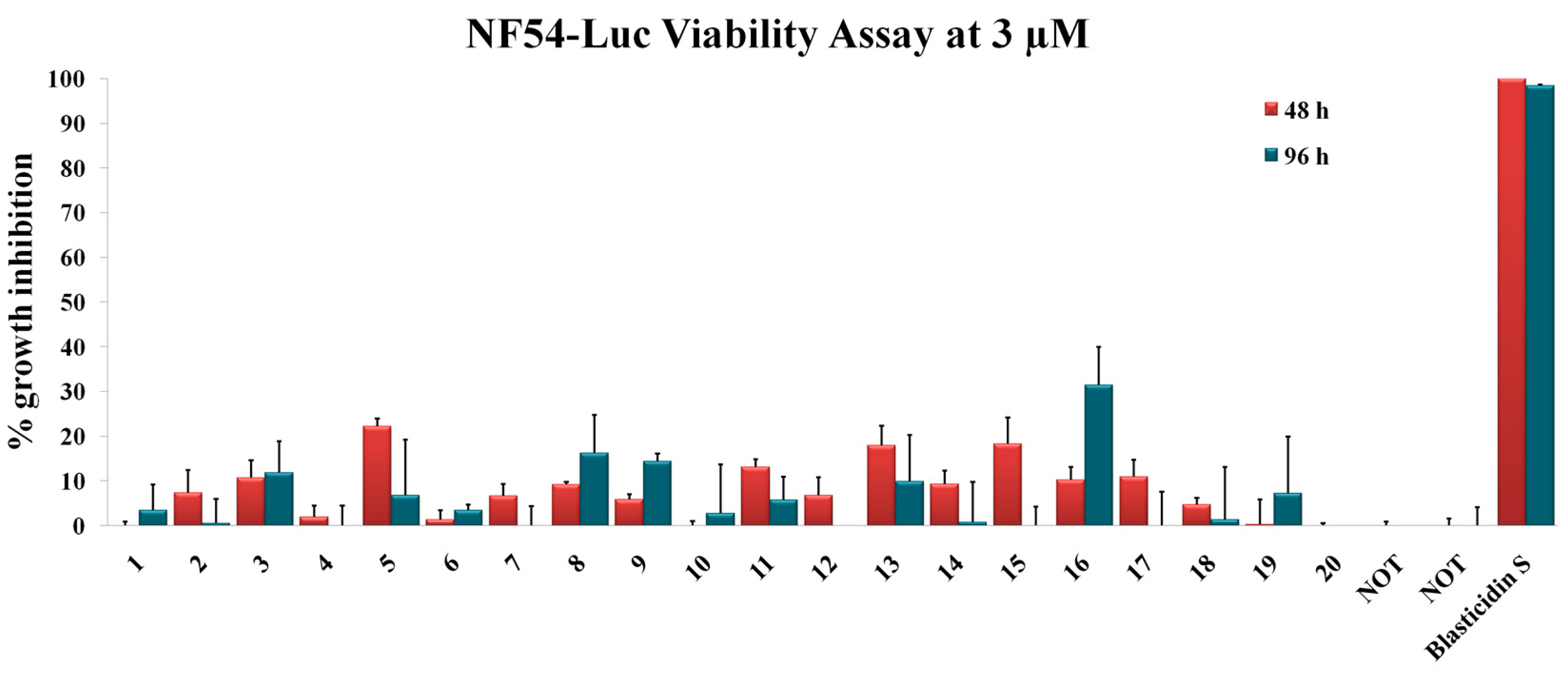 Results of the in vitro assay of derivatives 1–20 in 3 µM concentration against P. falciparum NF54-Luc parasite line with 48 h (red) and 96 h (blue) incubation time. NOT: no treatment; Blasticidin S: antibiotic used as antiplasmodial standard.