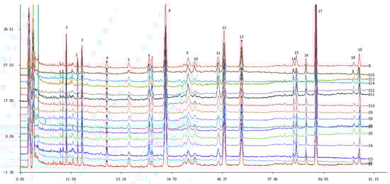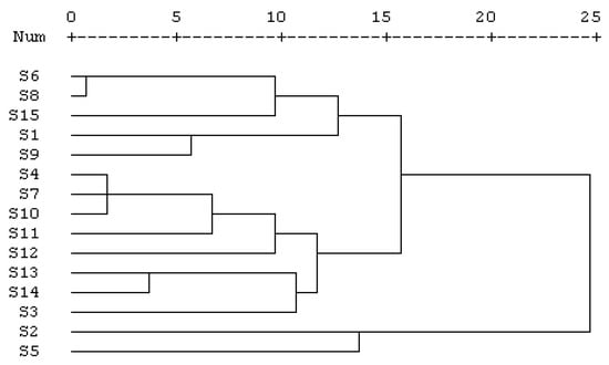 The results of CA are shown in Figure 6, where the quality characteristics are revealed more clearly. The cluster analysis results show that the samples could be divided into three quality clusters. Among them, Cluster I includes the samples S6, S8, S15, S1 and S9, Cluster III includes S2, S5 and the others are in Cluster II. All the compounds in Cluster III had much higher concentrations than the other two clusters.