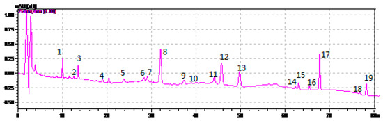 To evaluate the variations in quality of the 15 samples, PCA was carried out with the relative amounts of each identified component. The contents of 19 fingerprint peaks were applied to evaluate the sample variations. Figure 7 shows the score plots obtained by PCA. The first six principal components accounted for 89.329% of the total variance. Examination of the score plots indicates that the main components responsible for the separation were 3-epi-dehydrotumulosic acid (F13), 6α-hydroxyldehydropachymic acid (F6), 24(31)-trien-21-oic acid (F4), 24(31)-trien-21-oic acid (F7), 3-oxo-6,16α-dihydroxylanosta-7, 9 (F15), 29-hydroxydehydrotumulosic acid (F1), dehydropachymic acid (F12), as shown in Table 3. These components were deemed to be the marker compounds of sample variation. This result is in accord with the one obtained from the cluster analysis (CA). The combination of PCA and CA was thus a useful tool for quality control and evaluation of P. cocos.