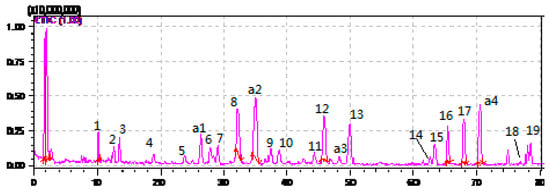 In the ESI-MS2 spectra, [M − H2O − H]− ions were found for compounds F1, F3, F7–F9 and F13, while [M − CH4 − HCOOH − H]− ions were seen for compounds F1, F10, F16 and a1–a4. Meanwhile, compounds F8, F12, F13, F16, a3 and a4 showed a [M − HCOOH − H]− ion and F6, F14–F17 formed a [M − CH3COOH − H]− ion. The [M − CO2 − H]− ion was seen for compounds F5, F10, F12 and F14 and F15, F17 and F19 displayed a [M − CH4 − H]− ion. The [M − 2CH4 − HCOOH − H]− ion was observed for compounds F3, F12 and a3. The latter compound, F8 and F13 displayed [M − 2CH4 − side chain on D ring − H]− ions. [M − 2CH4 − H]− ions were found for compounds F1 and F2, while F1 and F19 had [M − H2O − side chain on D ring − H]− ions. Compounds F3 and a3 showed a [M − 2CH4 − H2O − HCOOH − H]− ion, F8 and F13 had a [M − CH4 − side chain on D ring − H]− ion and F9 and a2 had [M − 3CH3 − H]− ion. [M − H2O − CH3COOH − H]− and [M − H2O − CH4 − CH3COOH − H]− ions were found for compounds F15 and F17. Compound a3 had [M − 2H2O − 2CH4 − HCOOH − H]− and [M − 3CH4 − HCOOH − H]− ions, whereas a4 showed [M − 2H2O − CH3COOH − H]− and [M − CH4 − HCOOH − CH3COOH − H]− ions and a2 showed a [M − 3CH4 − H]− ion. Compound F10 presented a [M − CH4 − 2H2O − HCOOH − RDA fragmentation of B ring − H]− ion while compound F1 had a [M − CH4 − H2O − HCOOH − H]− one. A [M − H2O − HCOOH − H]− ions was observed for compound F3. Compound F4 showed a [M − 2CH3 − H]− ion. The [M − CH4 − HCOOH − RDA fragmentation of B ring − H]− ion was observed for compound F9 and compound F12 presented a peak for a [M − 2CH4 − RDA fragmentation of B ring − H]− ion. The [M − 2H2O − CH4 − CO2 − CH3COOH − H]− ion was observed in the spectrum of compound F14 and an [M − HCO−Ar−OH −H]− ion was found for compound F18.