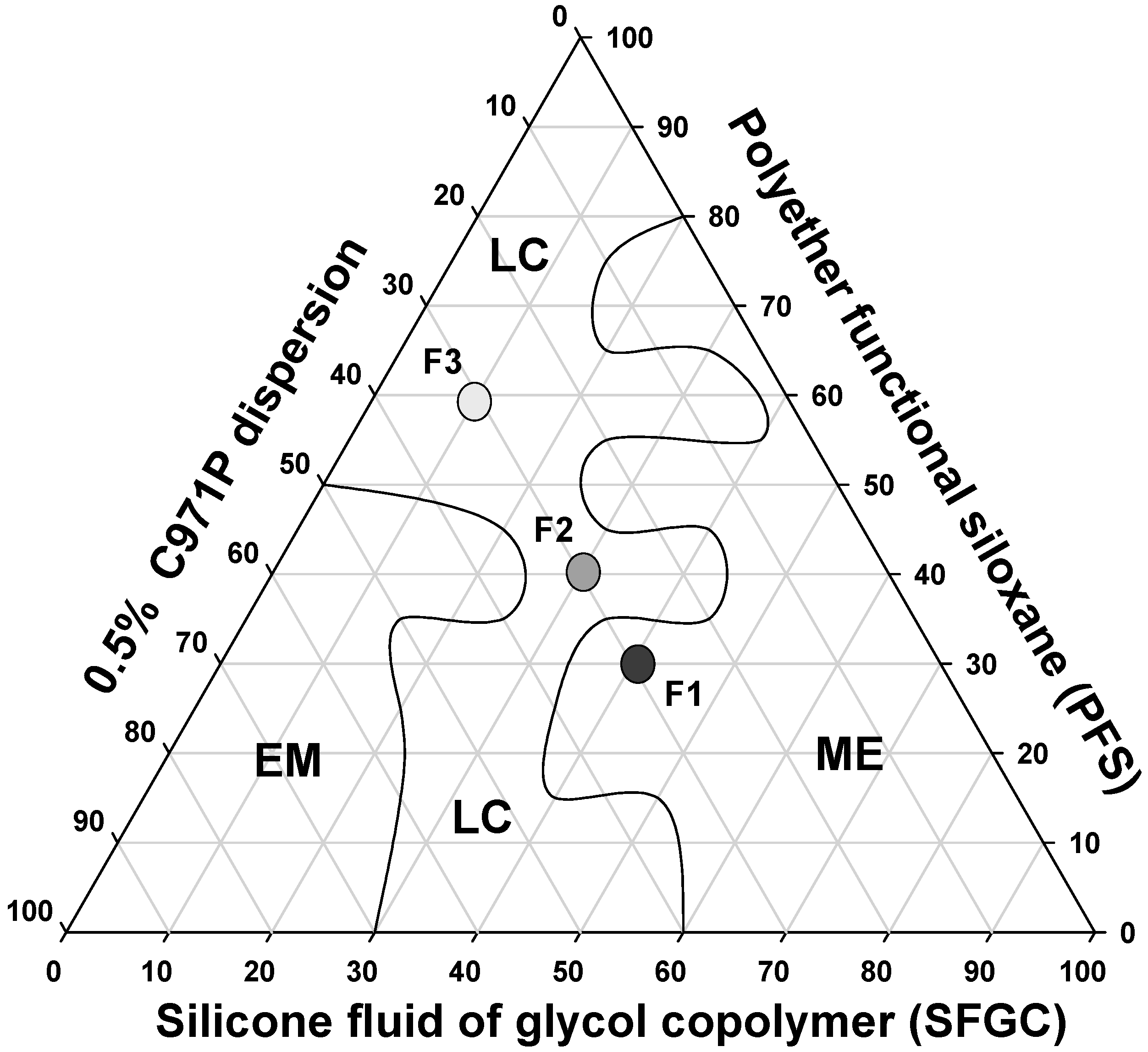 Phase diagram of system stabilized with PFS, SFGC and C971 0.5% polymeric dispersion. The marked areas represent: (LC) liquid crystal (ME) microemulsion and (EM) emulsion.