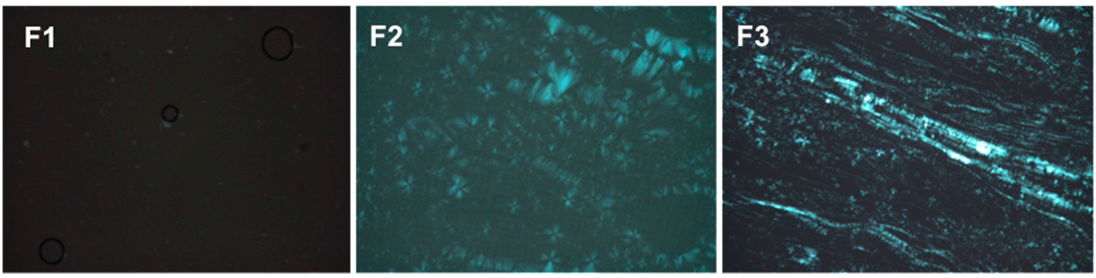 Photomicrographs obtained using polarized light microscopy (PLM) that show the dark field, the Maltese crosses characteristic of lamellar phases and the streaks of the hexagonal phases of F1, F2 and F3, respectively.