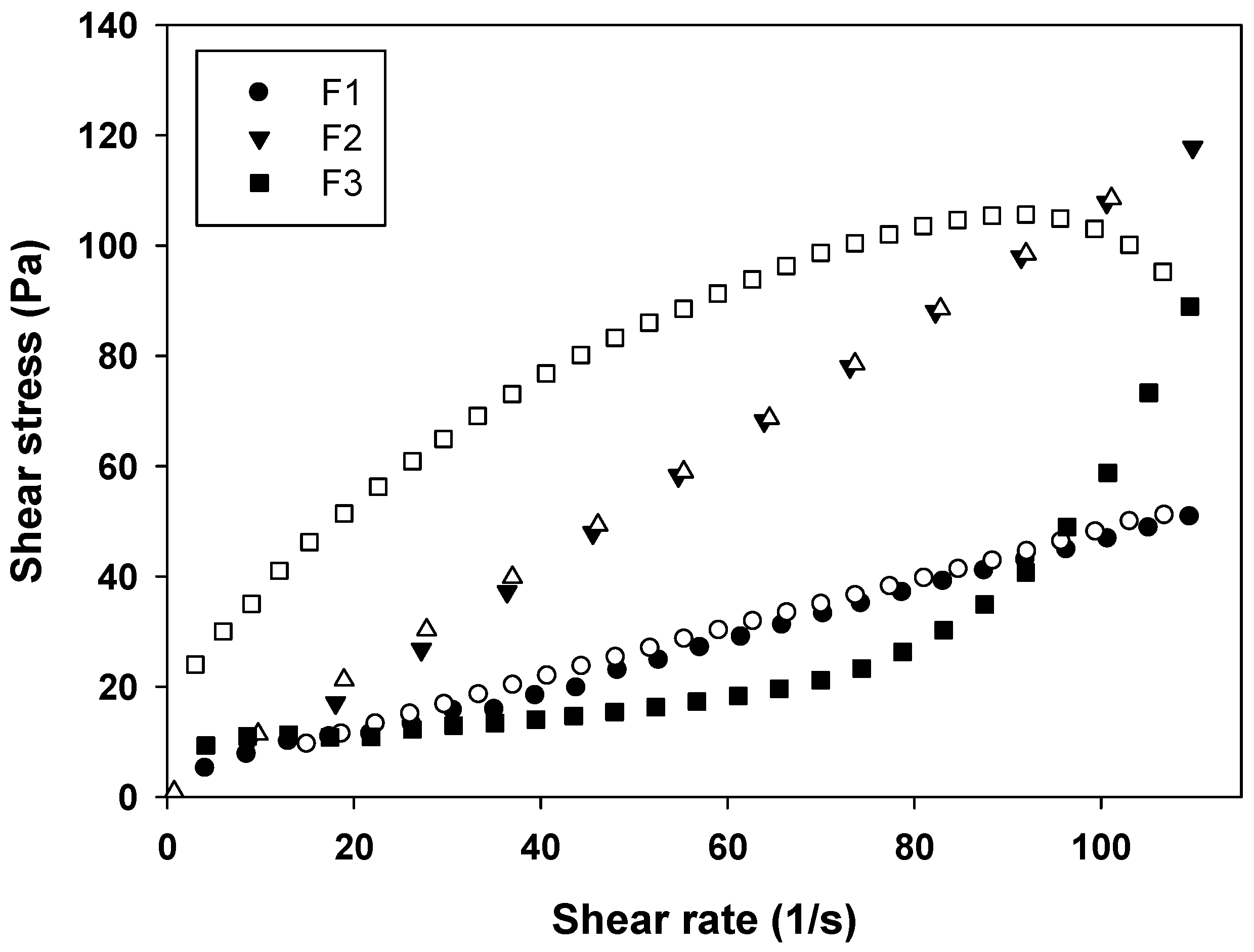 Flow rheogram of F1 (●), F2 (▼) and F3 (■). Closed symbols represents the up curve and open symbols represents the down curve. Standard deviations have been omitted for clarity; however, in all cases, the coefficient of variation of triplicate analyses was less than 10%. Data were collected at 32 ± 0.5 °C.