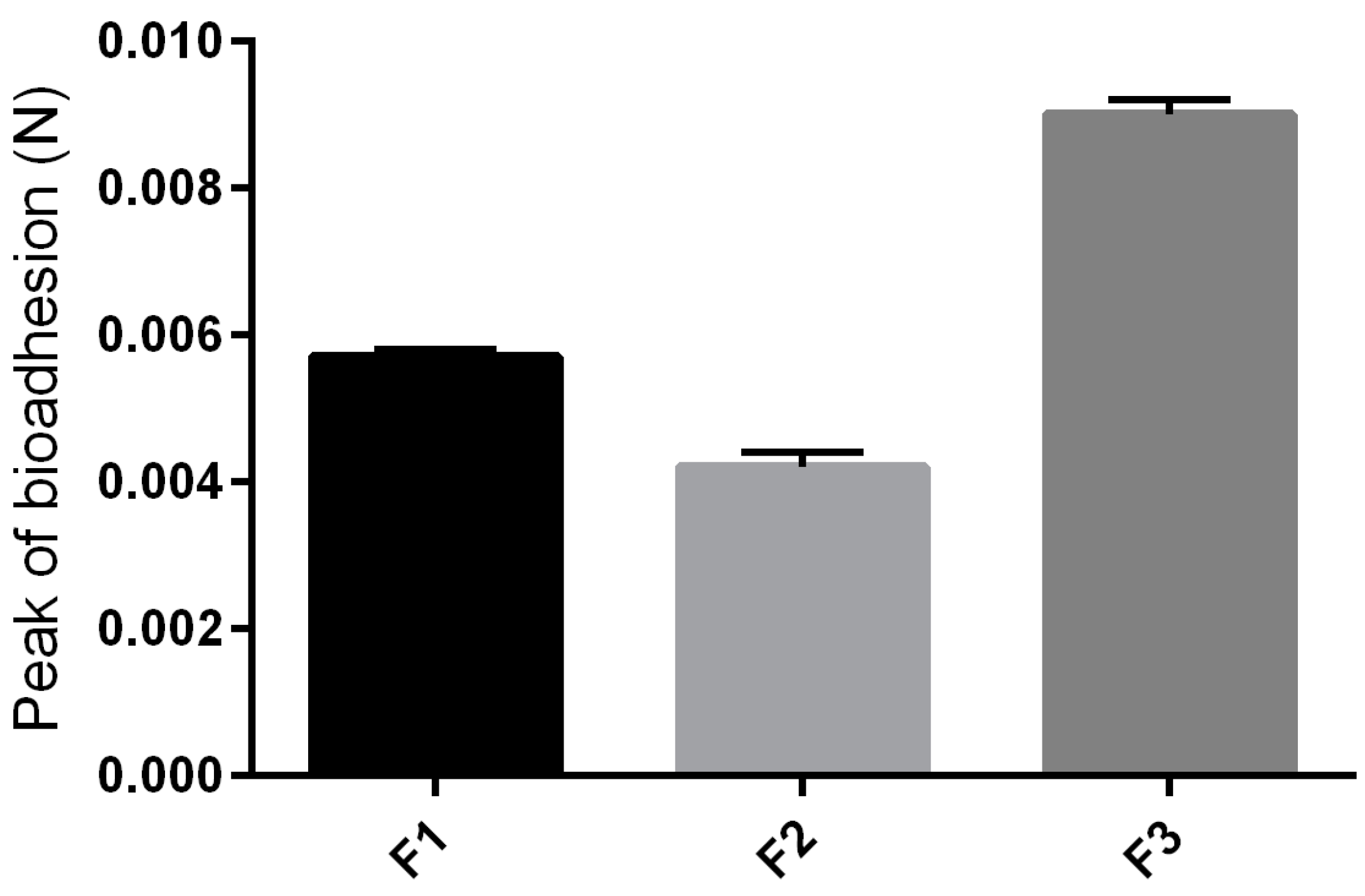 Parameters of the in vivo bioadhesion tests of F1, F2 and F3.