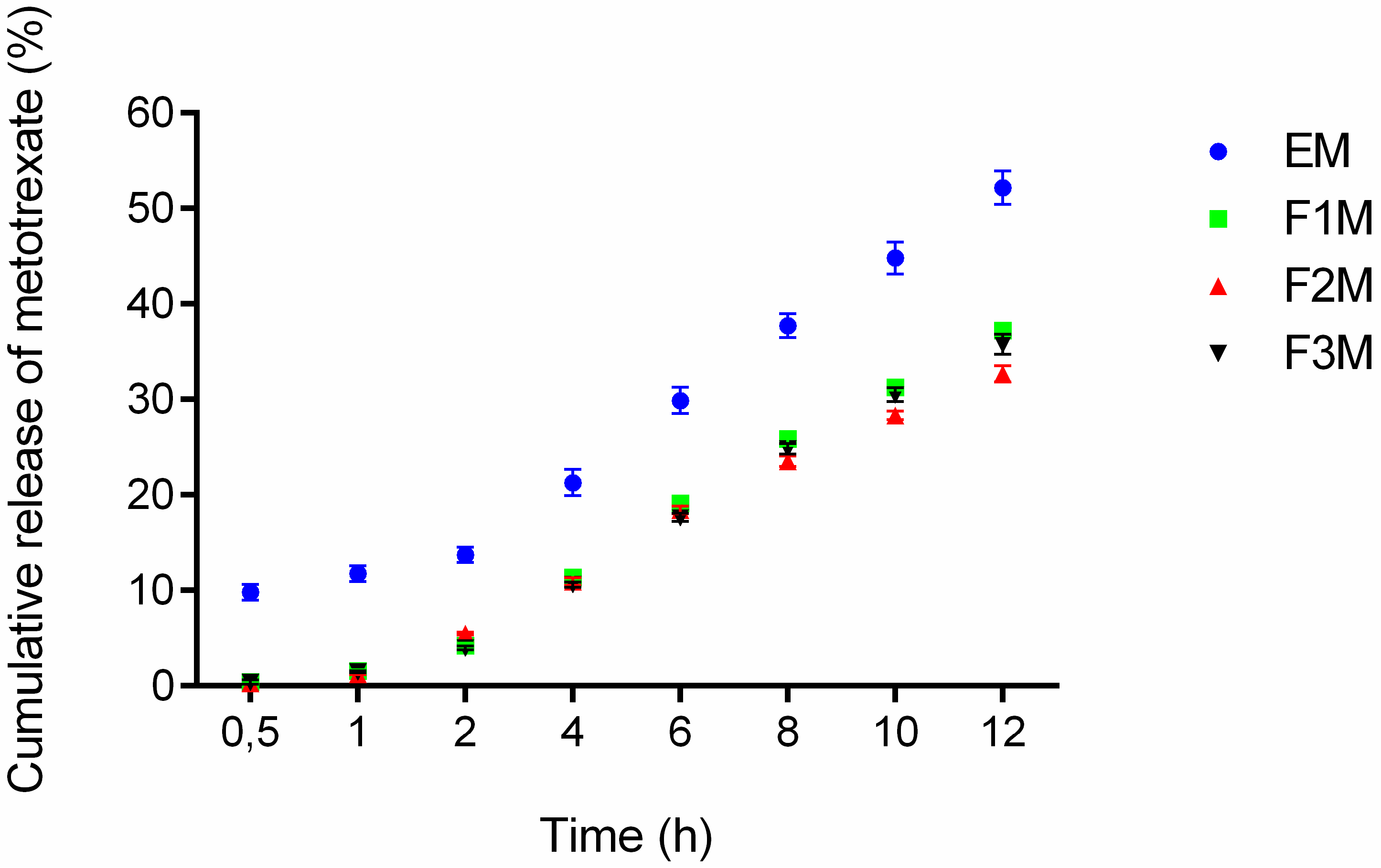 In vitro drug release profile of methotrexate-loaded FM1, FM2, FM3 formulations and the control EM (emulsion system) (n = 6).
