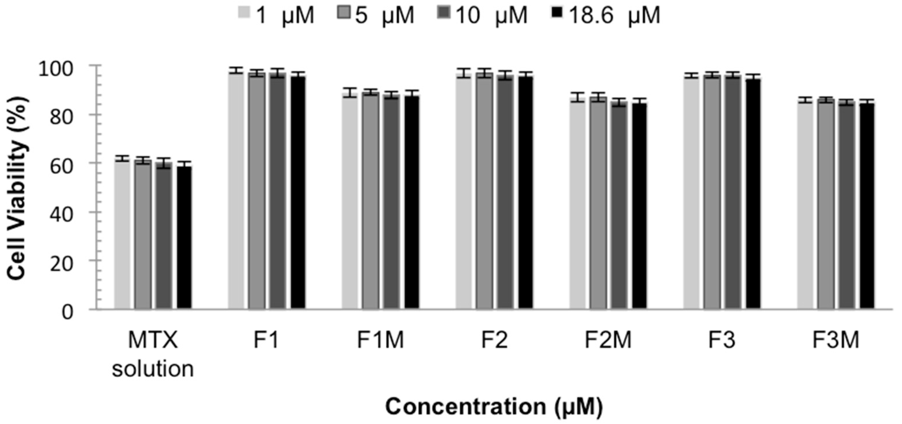 Cellular Viability of MTX solution, MTX-unloaded LCS (F1, F2 and F3) and MTX-loaded LCS (F1M, F2M and F3M) HaCaT cells for 48 h.