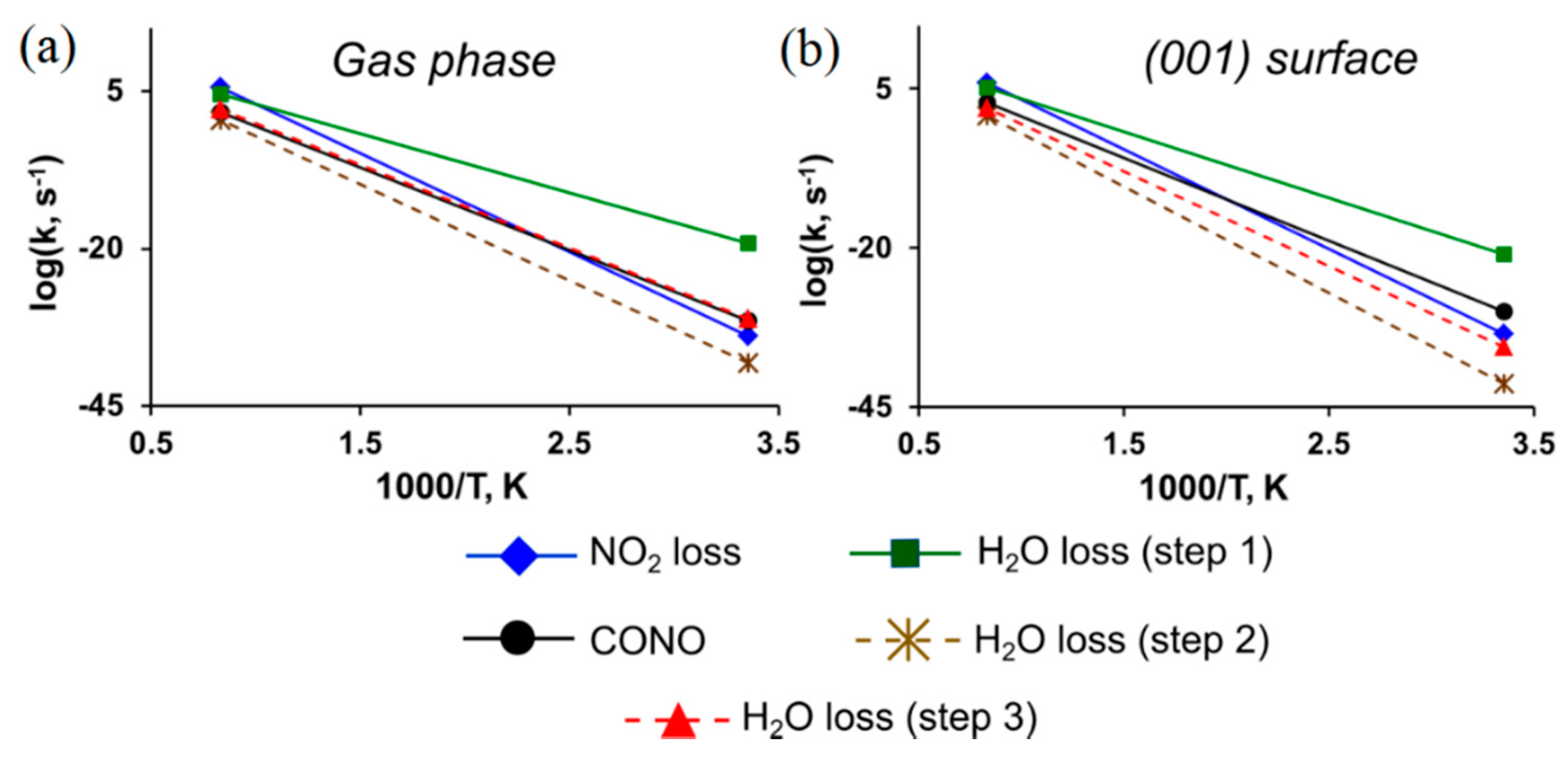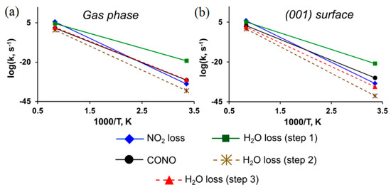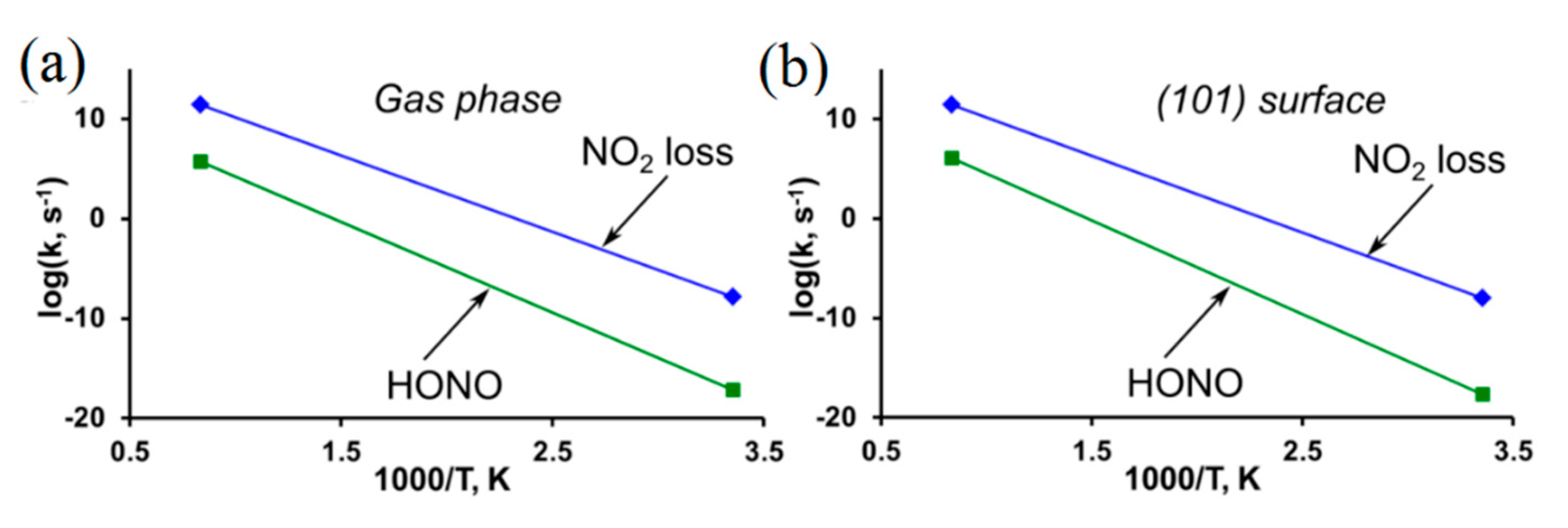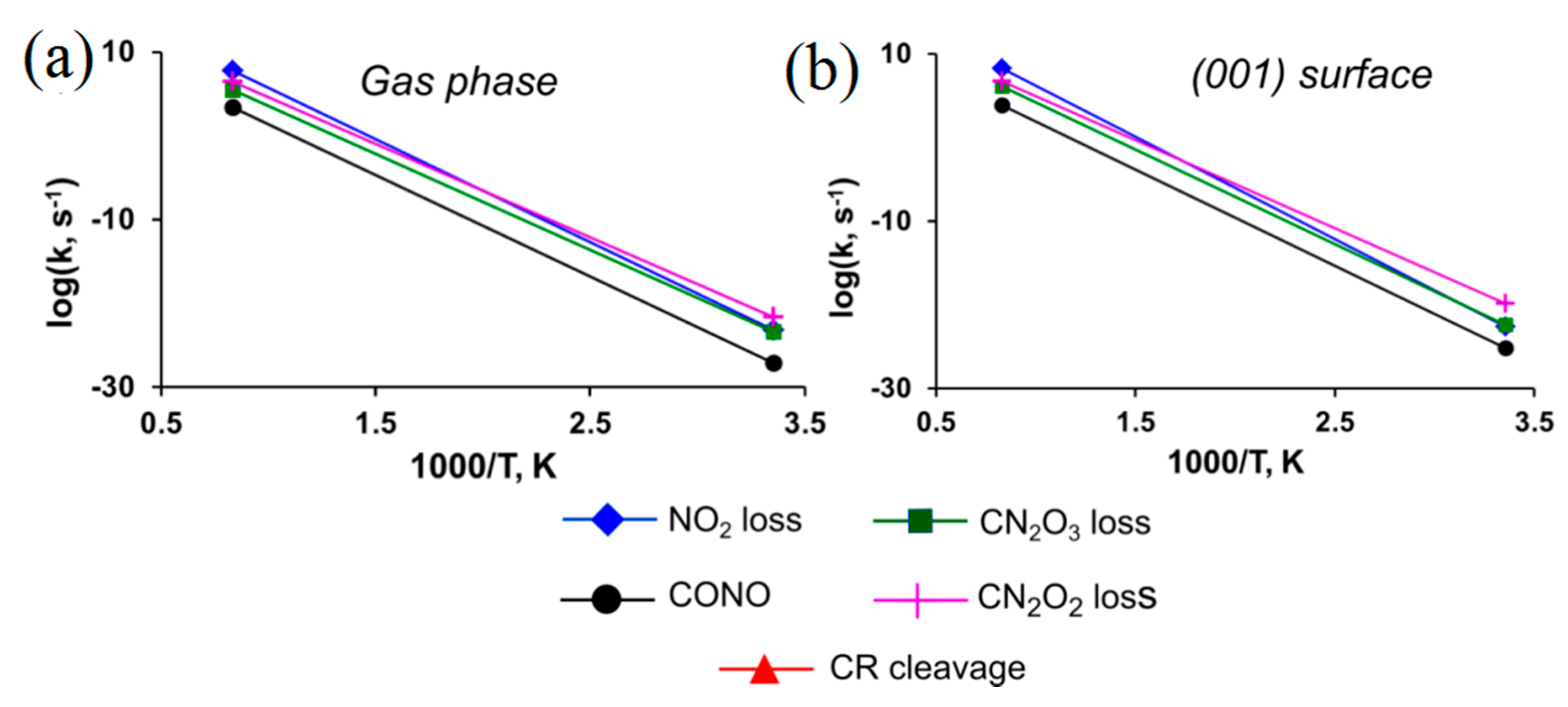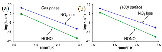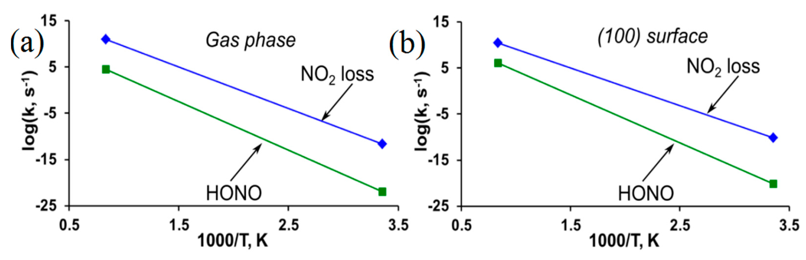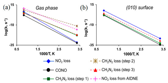 - Sharia, O.; Kuklja, M.M. Ab Initio kinetics of gas phase decomposition reactions. J. Phys. Chem. A 2010, 114, 12656–12661. [Google Scholar] [CrossRef] [PubMed]