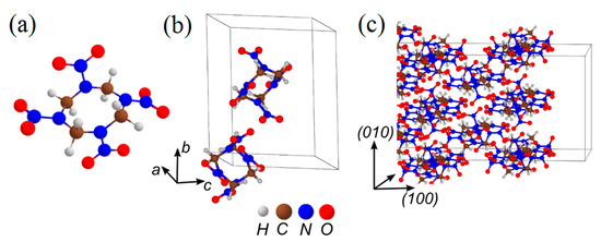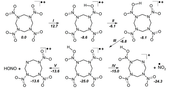 - Sharia, O.; Kuklja, M.M. Modeling thermal decomposition mechanisms in gaseous and crystalline molecular materials: application to β-HMX. J. Phys. Chem. B 2011, 115, 12677–12686. [Google Scholar] [CrossRef] [PubMed]