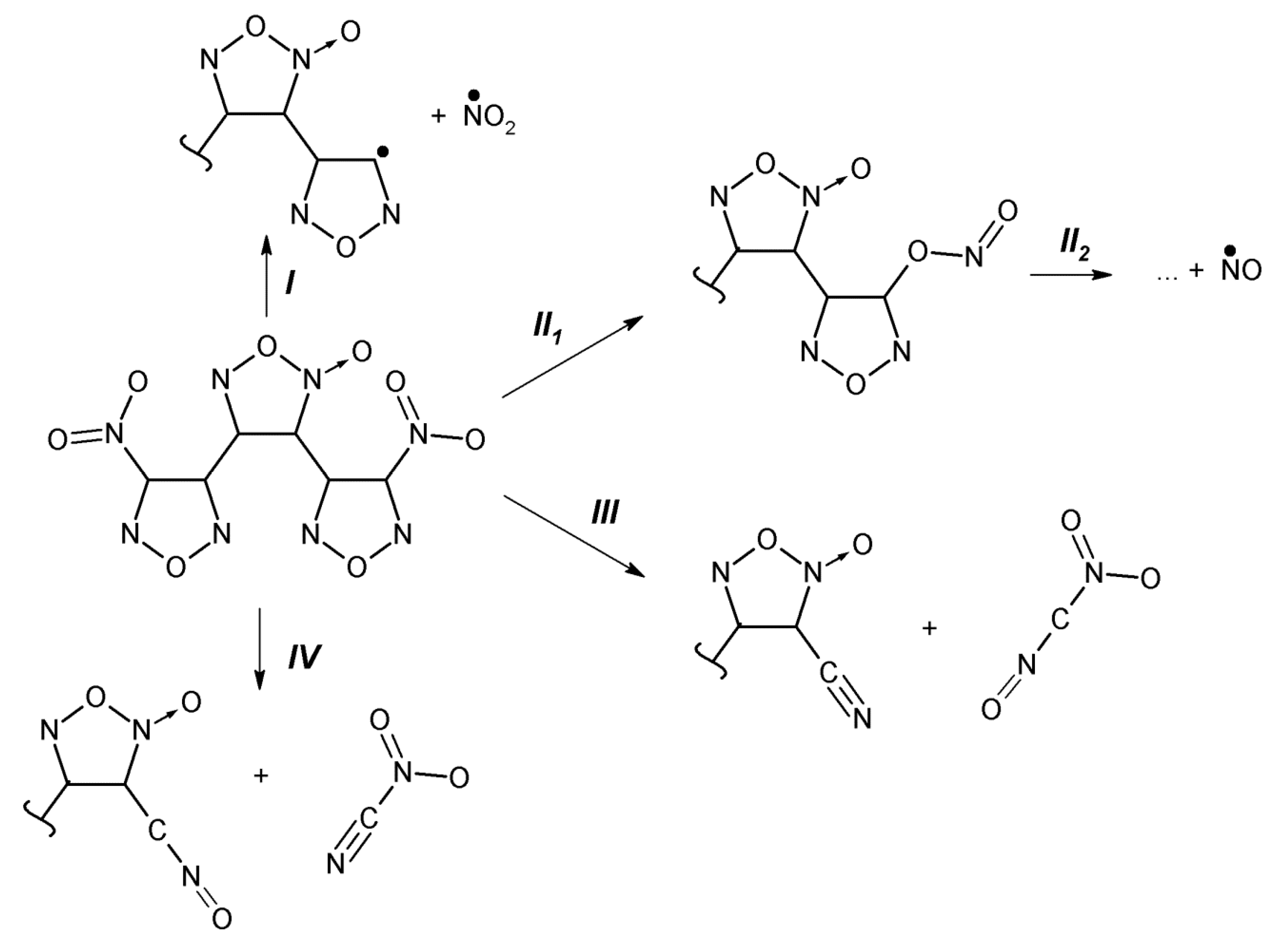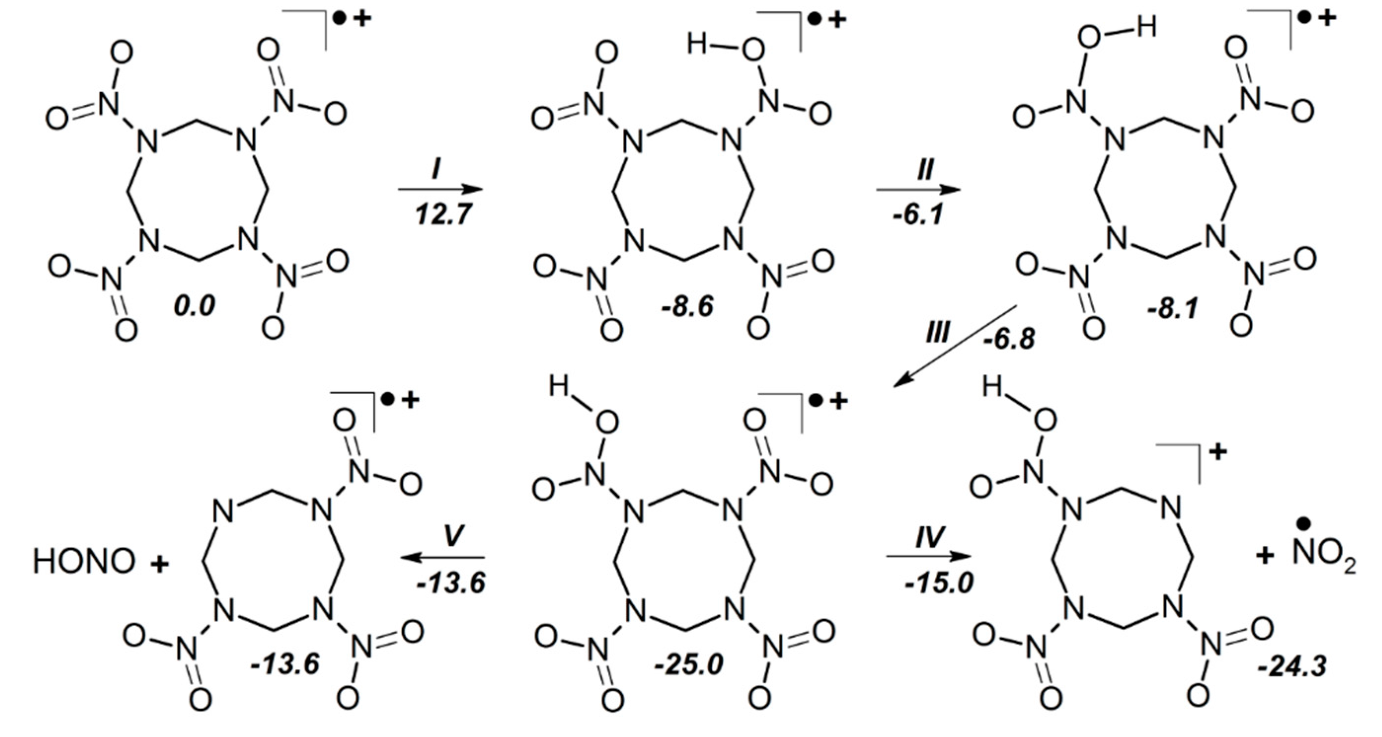 - Burov, Y.M.; Nazin, G.M. Influence of structure on rate of decomposition of secondary nitramines in the gas phase. Kinet. Catal. 1982, 23, 5–10. [Google Scholar]