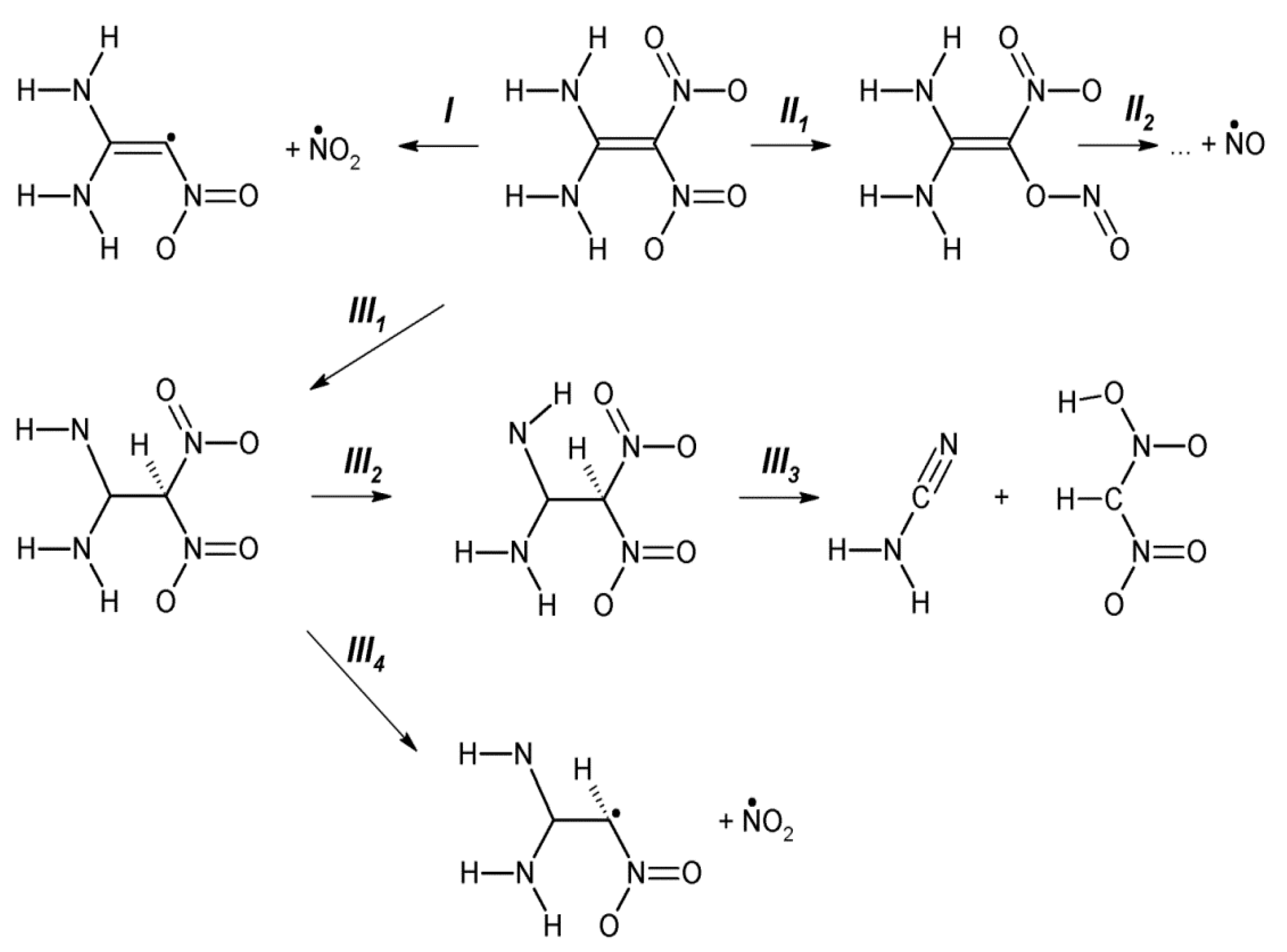 - Booth, R.S.; Butler, L.J. Thermal decomposition pathways for 1,1-diamino-2,2-dinitroethene (FOX-7). J. Chem. Phys. 2014, 141. [Google Scholar] [CrossRef] [PubMed]