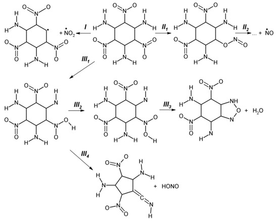 - Brill, T.B.; James, K.J. Kinetics and mechanisms of thermal decomposition of nitroaromatic explosives. Chem. Rev. 1993, 93, 2667–2692. [Google Scholar] [CrossRef]