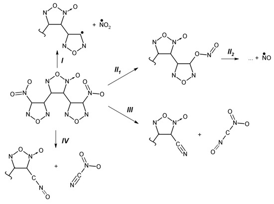 - Tsyshevsky, R.; Pagoria, P.; Zhang, M.; Racoveanu, A.; de Hope, A.; Parrish, D.; Kuklja, M.M. Searching for low-sensitivity cast-melt high-energy-density materials: Synthesis, characterization, and decomposition kinetics of 3,4-bis(4-nitro-1,2,5-oxadiazol-3-yl)-1,2,5-oxadiazole-2-oxide. J. Phys. Chem. C 2015, 119, 3509–3521. [Google Scholar] [CrossRef]