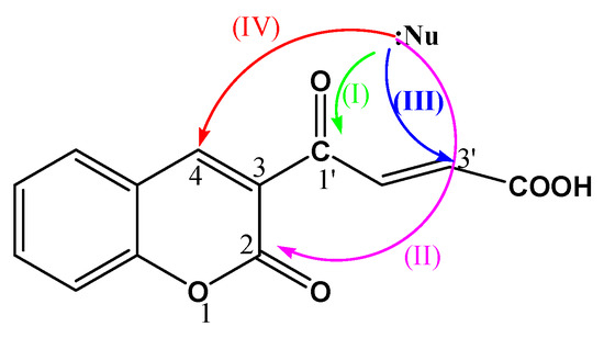 In principle, a nucleophile might be expected to attack a coumarin substrate at any of the electrophilic centers, C-1′ (I) C-2 (II), C-3′ (III) or C-4 (IV) as illustrated in Figure 2.